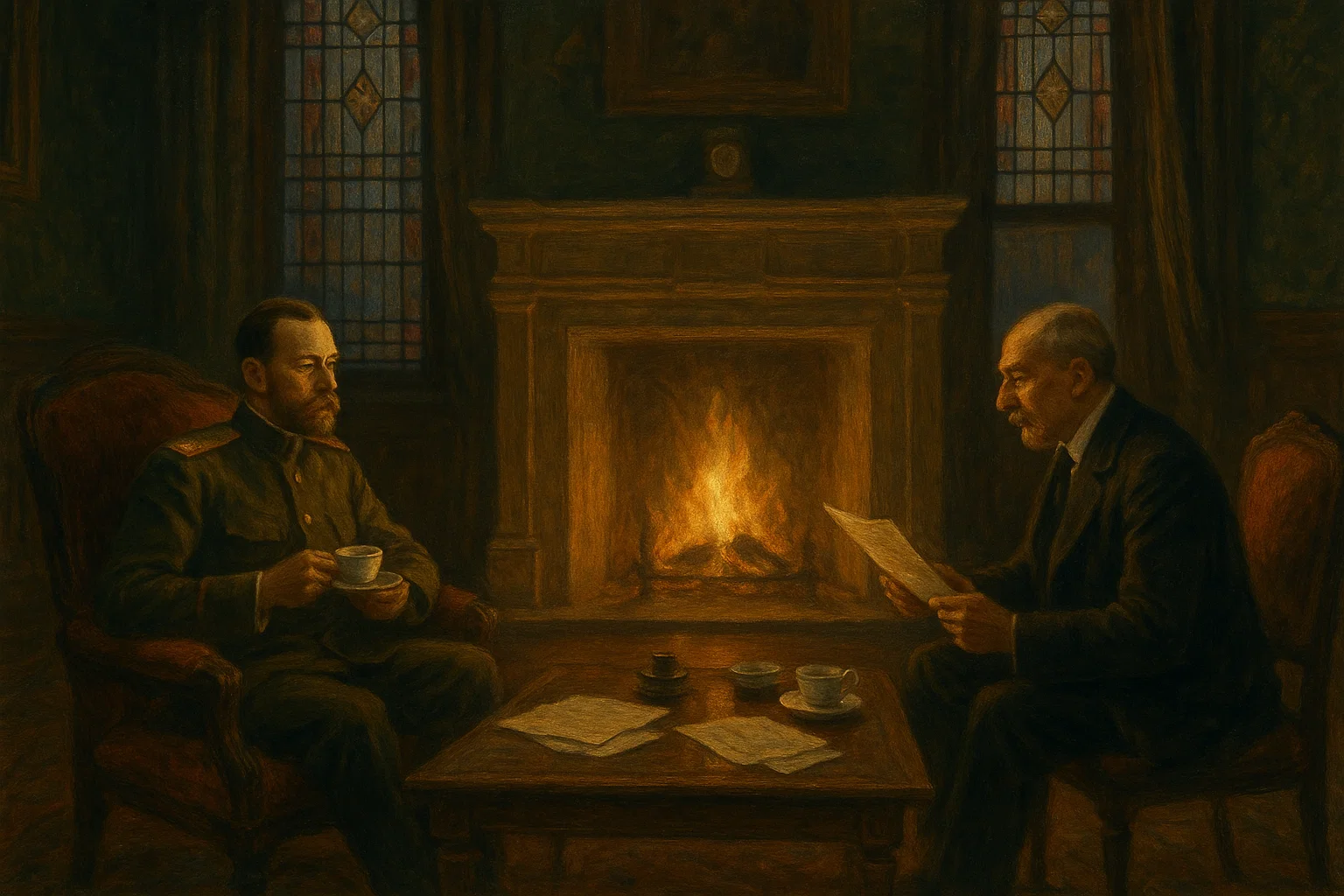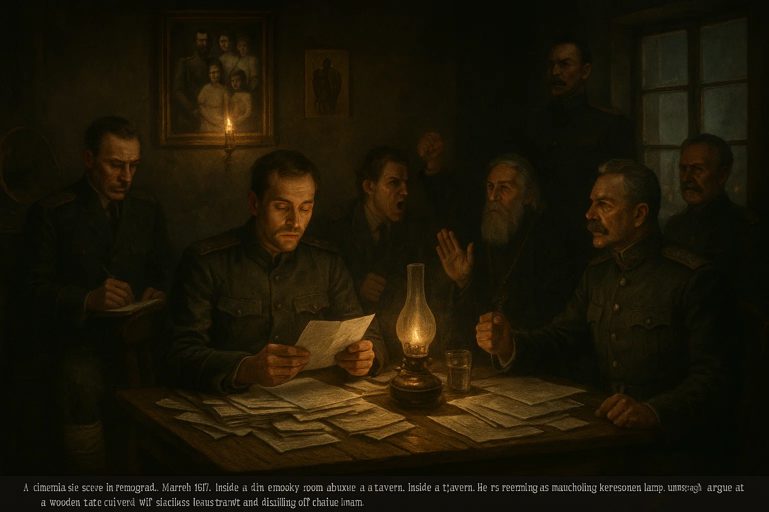 Воздух в комнате стал тяжелее, будто стены приблизились. Голос Дорошенко ударил по тишине низко и властно: — «Довольно. Все слова ваши истинны. Но цель наша едина и нерушима: освободить Николая II и Его Семью изъ узъ Царскаго Села. Сіе есть не только долгъ, но и спасеніе Россіи. Всё иное, что нынѣ зовётся Россіей, — фарсъ и гниль».