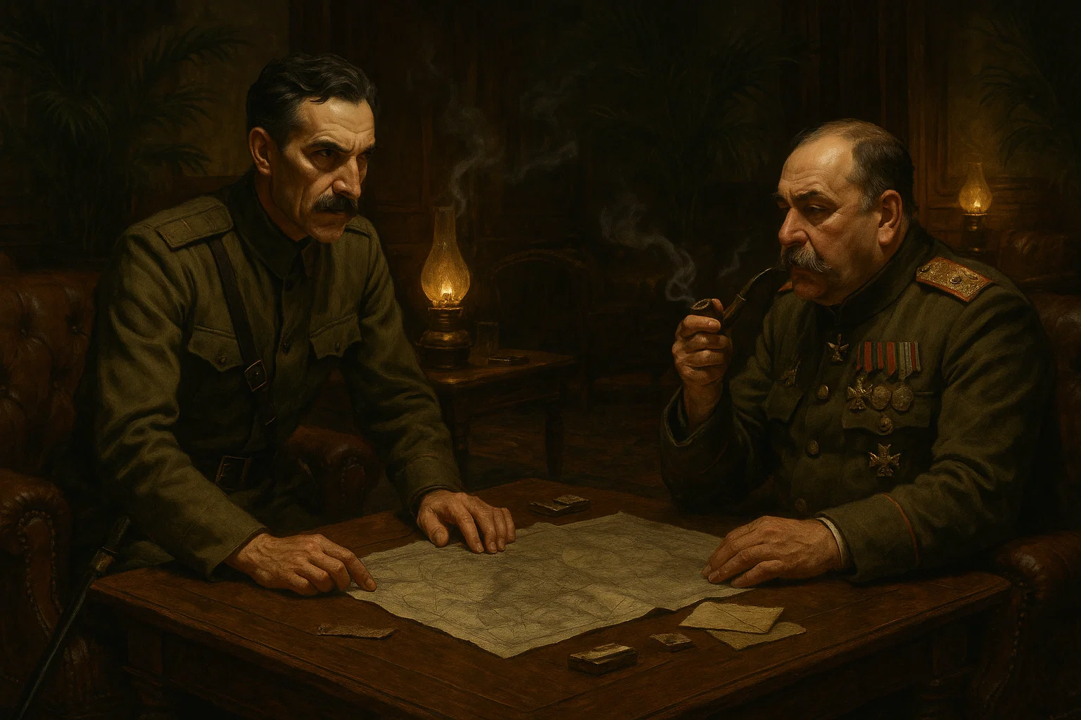 Полковник Сергей Оболенский, сухой и педантичный штабист, сложил руки на груди: — «Генералъ, истина въ вашихъ словахъ. Но прошу помнить: каждый шагъ нашъ долженъ быть просчитанъ. Армія разлагается, комитеты распоряжаются больше штабовъ. Ежели мы не создадимъ сеть связей въ клубахъ и комітетахъ офицерскихъ, останемся заговорщиками безъ войска. Надобно дѣйствовать хладнокровно, шагъ за шагомъ».