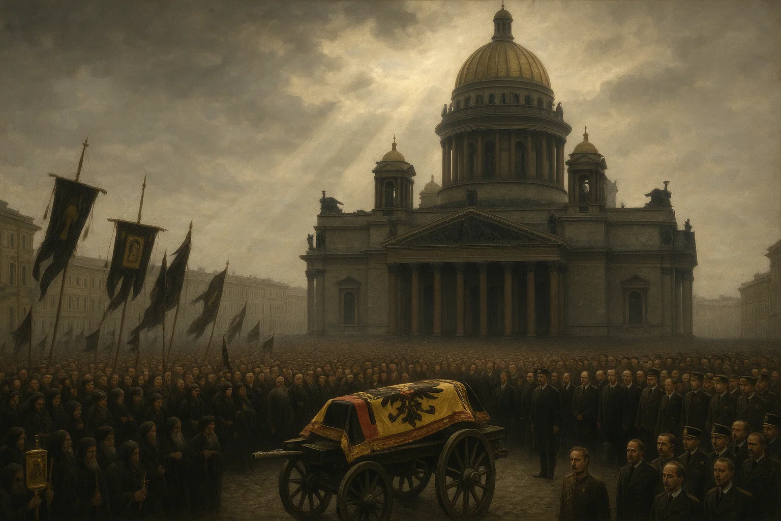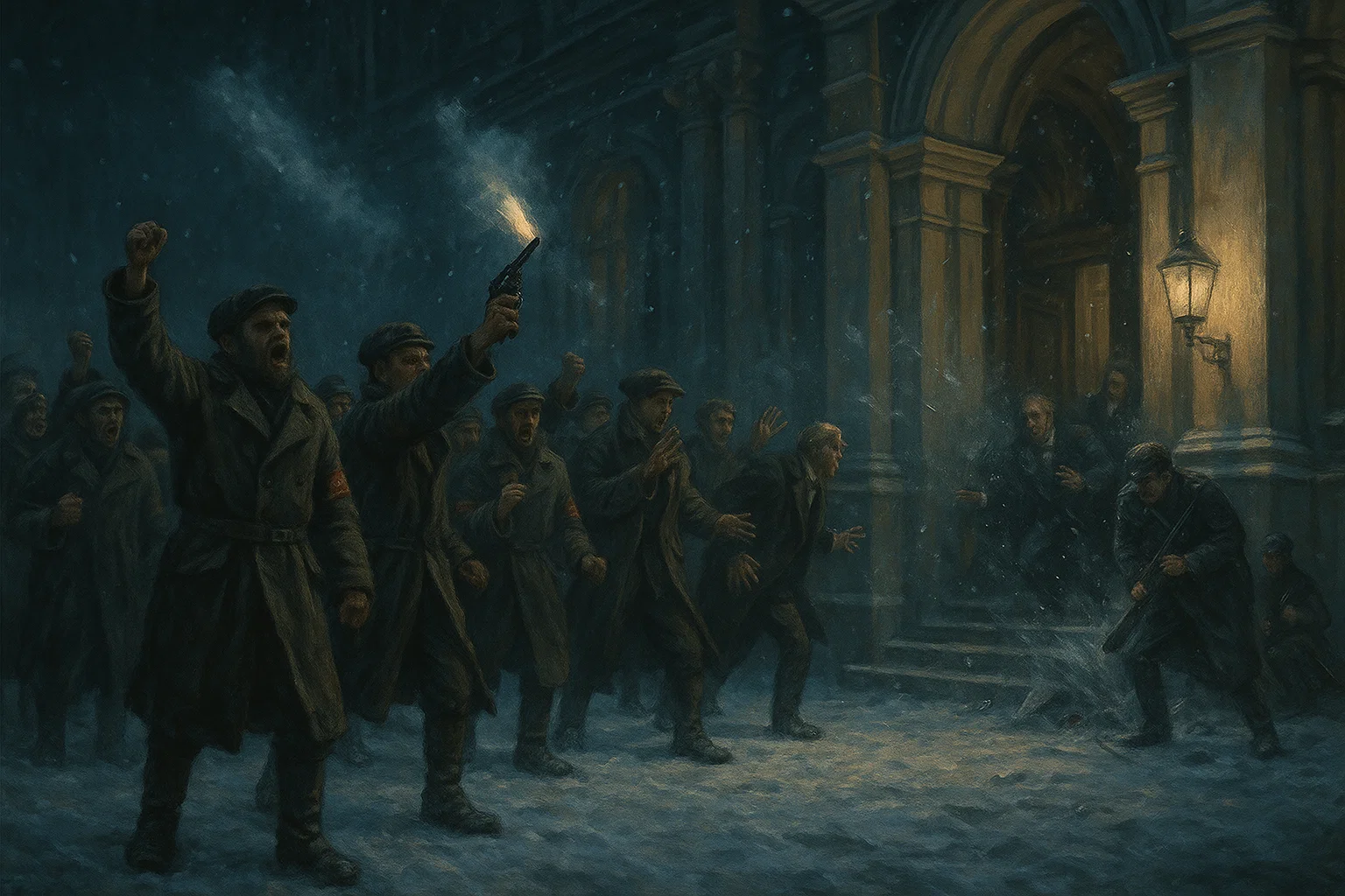 Вечер в Петрограде был тревожным. За окнами Лиговки стоял гул: отдалённые крики, треск ружейных выстрелов, иногда сухой лязг — то ли телеги с ранеными, то ли патрульная повозка. Город жил в состоянии постоянного бунта, и каждый звук словно подтверждал: Россия рушится. В каморке над трактиром было душно. Воздух тяжёлый от махорки и керосина, лампа коптила, бросая жёлтые тени на лица собравшихся. На стене висел портрет Царской Семьи — Николай, Александра и дети, ещё в парадных мундирах, словно из прошлого мира, который исчез за несколько дней. Перед портретом горела свеча. Рядом — икона Архангела Михаила. В углу патефон тихо выводил голос Вертинского. Пел он о тоске и обречённости, и каждый, кто слышал эти слова, будто понимал: они про них самих.