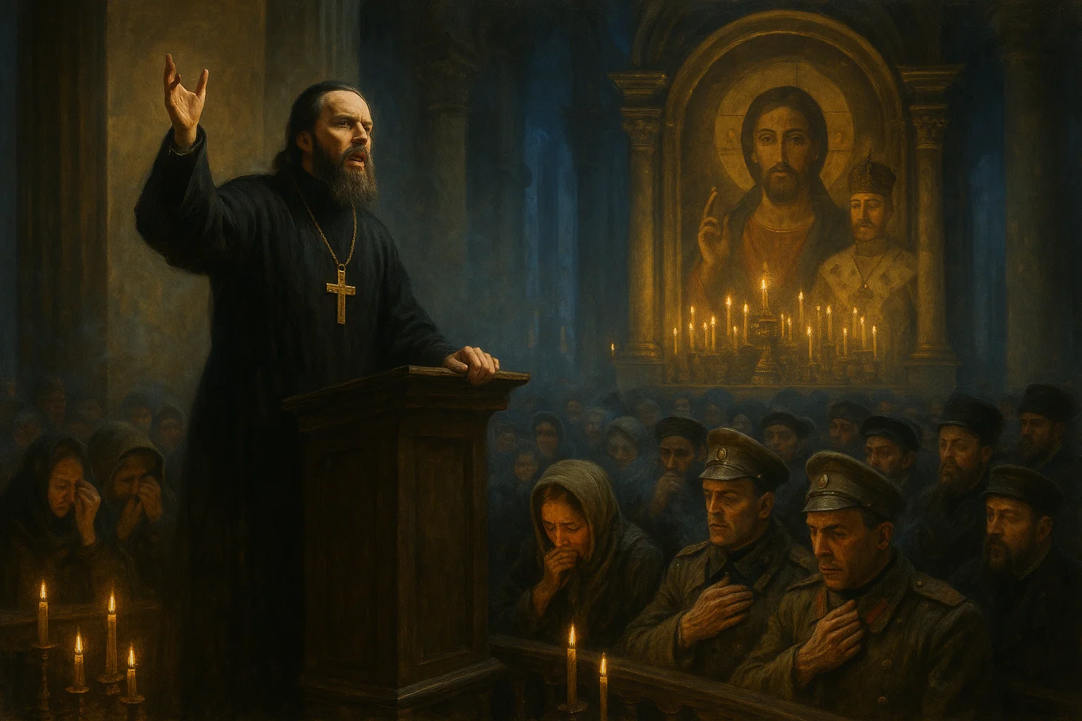 Протоиерей Иоанн Мельников, седой, с лицом, напоминающим икону, тяжело поднялся. Голос его был хриплым, но слова полнились фанатическим огнём: — «Братіе… Отреченіе — второе распятіе. Семья Государя — живыя мученики, уничиженіе ихъ есть жертва за грѣхи Россіи. Мы — апостолы Долга. На насъ обязанность возставить престолъ молитвою и кровію. Но да помните: безъ молитвы дѣло наше будетъ проклято, и пламя пожрётъ насъ самихъ».