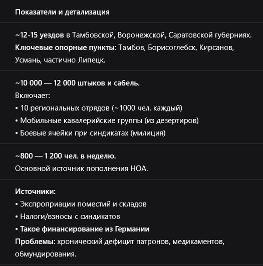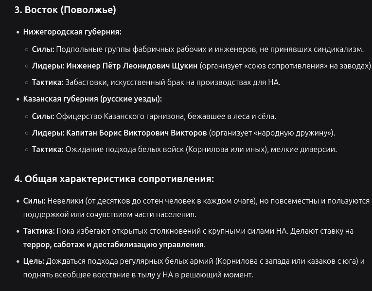Детальный разбор по пунктам: 1. Сильные стороны и потенциал: Идеологическая ясность и мощь: Лозунг «За Бога, Царя и Отечество» — проверенный, понятный и вызывающий глубинную ностальгию у миллионов. Трактовка отречения как «богоотречения» — гениальный пропагандистский ход, превращающий политику в религиозную войну. Реалистичная социальная база: Опора на офицерство, аристократию и буржуазию — не абстракция. Эти группы были реальными проигравшими после Февраля, обладали ресурсами, связями и горели жаждой реванша. Это надежный тыл. Выдающееся лидерство: Генерал Дорошенко — идеальный лидер для такой организации. Его бэкграунд в разведке и контрразведке — это ключевое преимущество перед всеми другими движениями. Он знает, как работать в тени, вербовать агентов, дезинформировать и наносить точечные удары. Это не кабинетный теоретик, а практик подпольной войны. Дисциплинированные силовые структуры: «Вооруженные дружины из фронтовиков и офицеров» — это качественно иной уровень угрозы, чем «плохо обученные мужики» мартыновцев. Это костяк будущей ударной силы для переворота. Финансирование: Наличие источников («офицерские кассы, тайные пожертвования...») делает движение финансово независимым и способным финансировать террор и агитацию.
