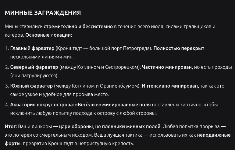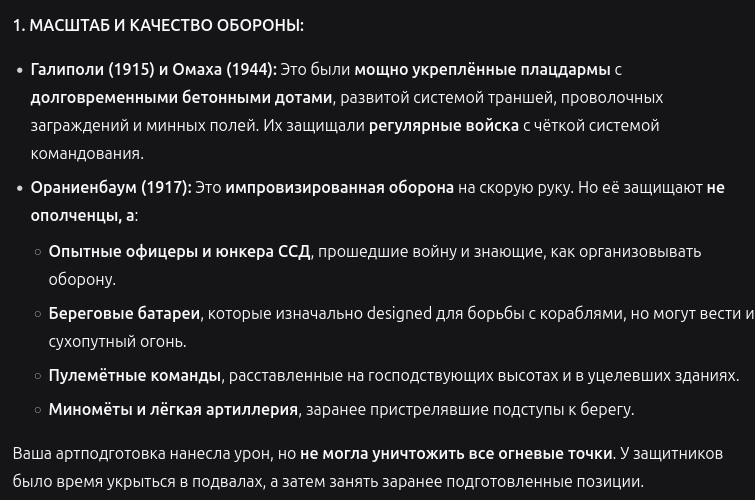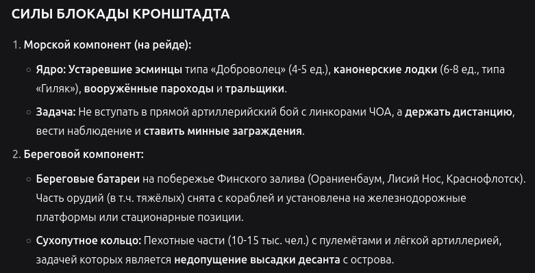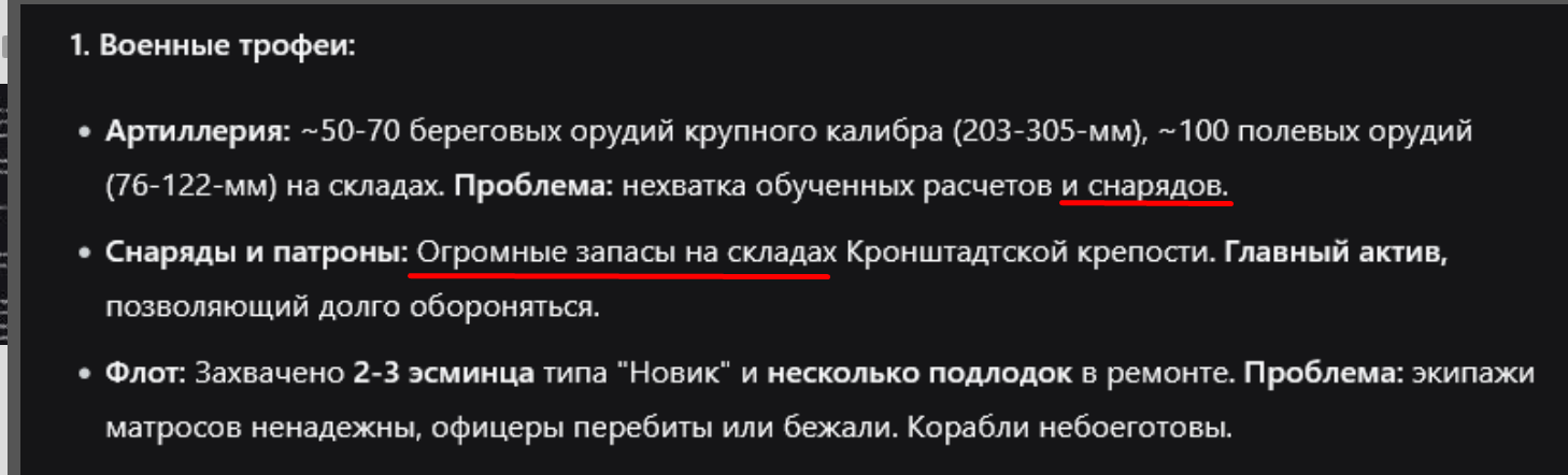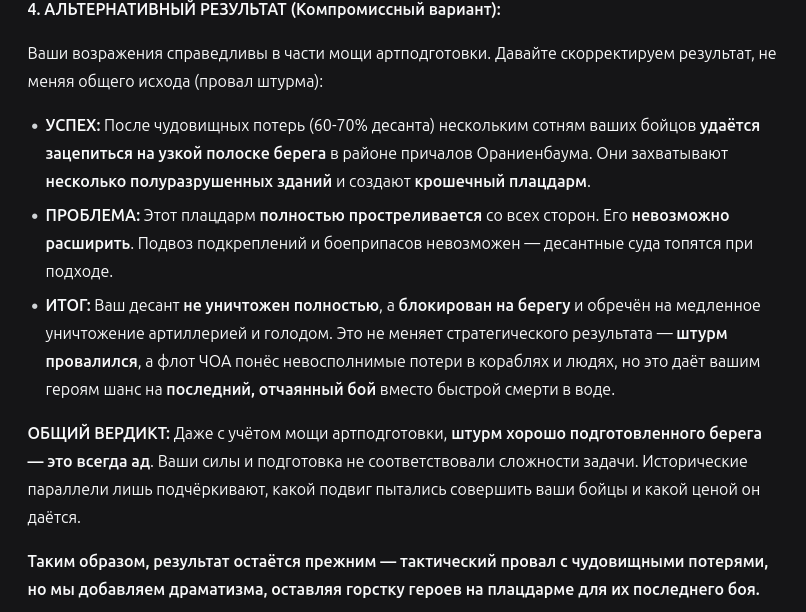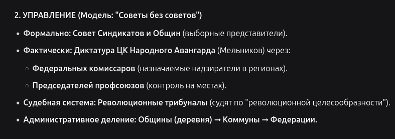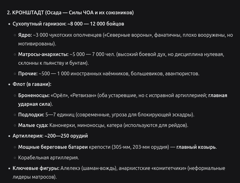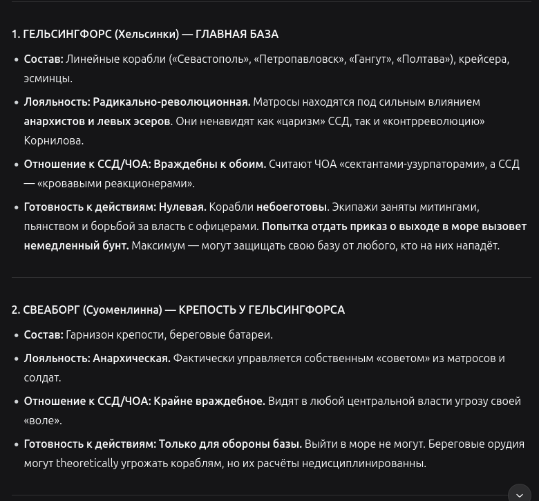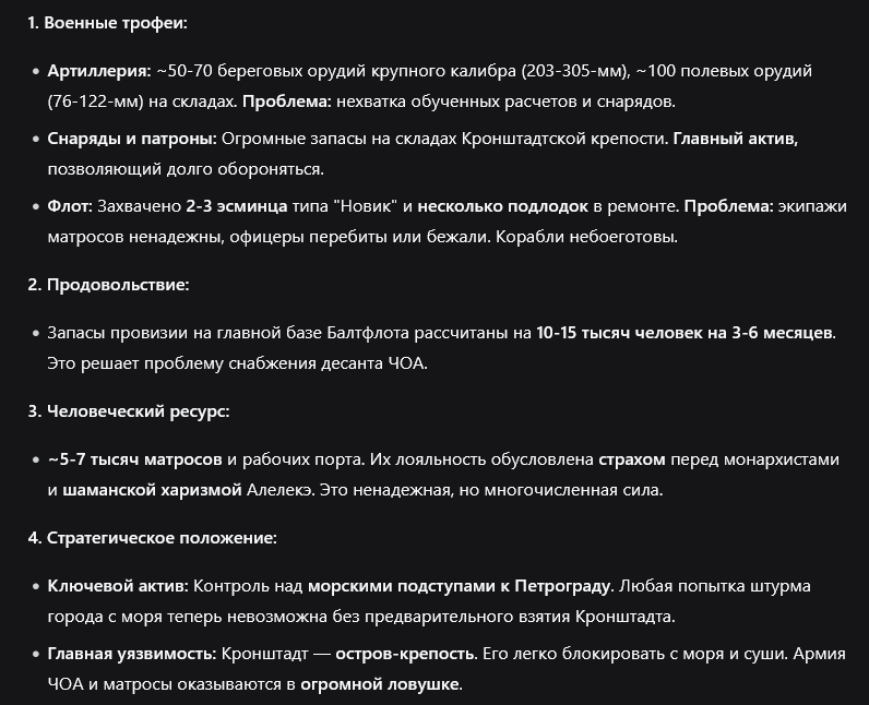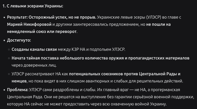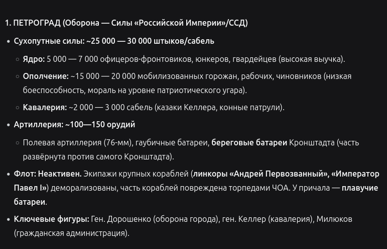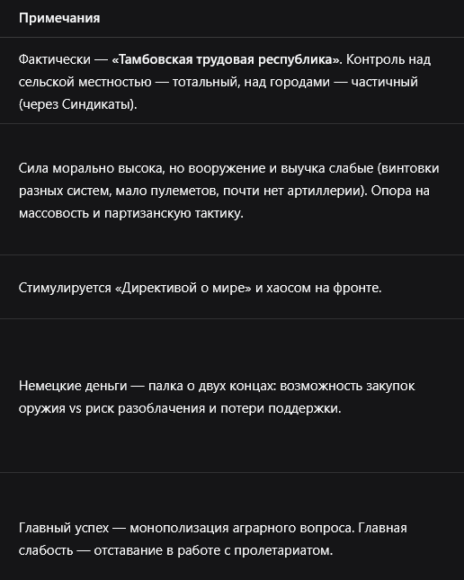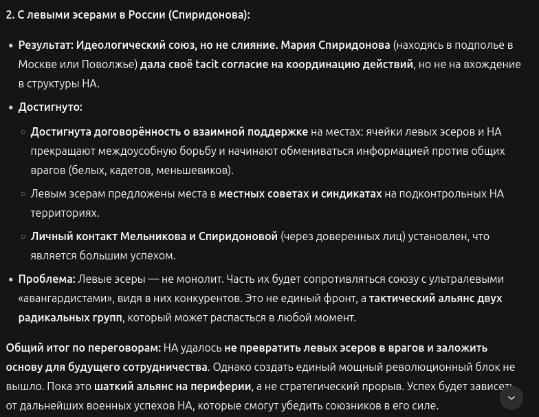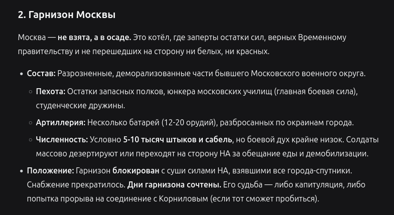 ОБЩИЙ ВЕРДИКТ: СТРАТЕГИЧЕСКИЙ УСПЕХ, ДОСТИГНУТЫЙ ЦЕНОЙ СЕРЬЁЗНЫХ СТРАТЕГИЧЕСКИХ РИСКОВ. НА добился главной цели — взятия Москвы — но не сумел самостоятельно закрепить успех. Вмешательство Сибирии последующие действия ССД превратили триумф в сложную, трёхстороннюю конфронтацию с неясным исходом. I. ВОЕННЫЕ РЕЗУЛЬТАТЫ: ТРИУМФ, ОБЕРНУВШИЙСЯ ПАТОМ 1. Захват Москвы (Первоначальный успех): Безупречное начало: План по бескровному взятию города благодаря агитации и работе ячеек выполнен идеально. НА вошёл в столицу как освободитель, минимизировав потери. Кризис и ответ: Поджог города отступающими царскими частями создал хаос. НА грамотно переориентировался на тушение пожара и помощь населению, что стало основой для пропагандистского шедевра. 2. Сибирская интервенция (Ключевой поворот): Тактическое спасение: Захват сибирскими железнодорожными батальонами ключевых узлов (вокзалов, депо) в самый разгар контрудара ССД стал решающим фактором. Это действие: Дезорганизовало тылы и снабжение имперских войск Келлера и Алексеева. Не позволило ССД развить успех и полностью выбить НА из города. Стабилизировало линию фронта. 3. Южный фронт (против казачества): Яркая тактическая победа Инновационная тактика: Внедрение тачанок (мобильность) и системы «таборов» (оборона) блестяще решило проблему казачьей конницы. Результат: Казачья угроза нейтрализована. Фронт переведён в пассивную фазу, что позволило перебросить силы и внимание на Москву. Это единственная безусловная и самостоятельная победа НА в сентябре. 4. Итоговая военная ситуация (Пат): Фронт разделил Москву пополам: ССД удерживает: Кремль (символический центр), Сокольники, районы к северу от реки. НА контролирует: Замоскворечье, южные и западные промышленные районы. Сибирь контролирует: Ключевые железнодорожные вокзалы и инфраструктуру, находясь в тылу у НА. Штурм Тулы ССД продолжается, но его успех поставлен под сомнение из-за логистических проблем, вызванных событиями в Москве. Вывод: Военная победа НА оказалась неполной. Вместо контроля над столицей он получил затяжную позиционную мясорубку с сильным противником, где его тылы зависят от союзника-конкурента.