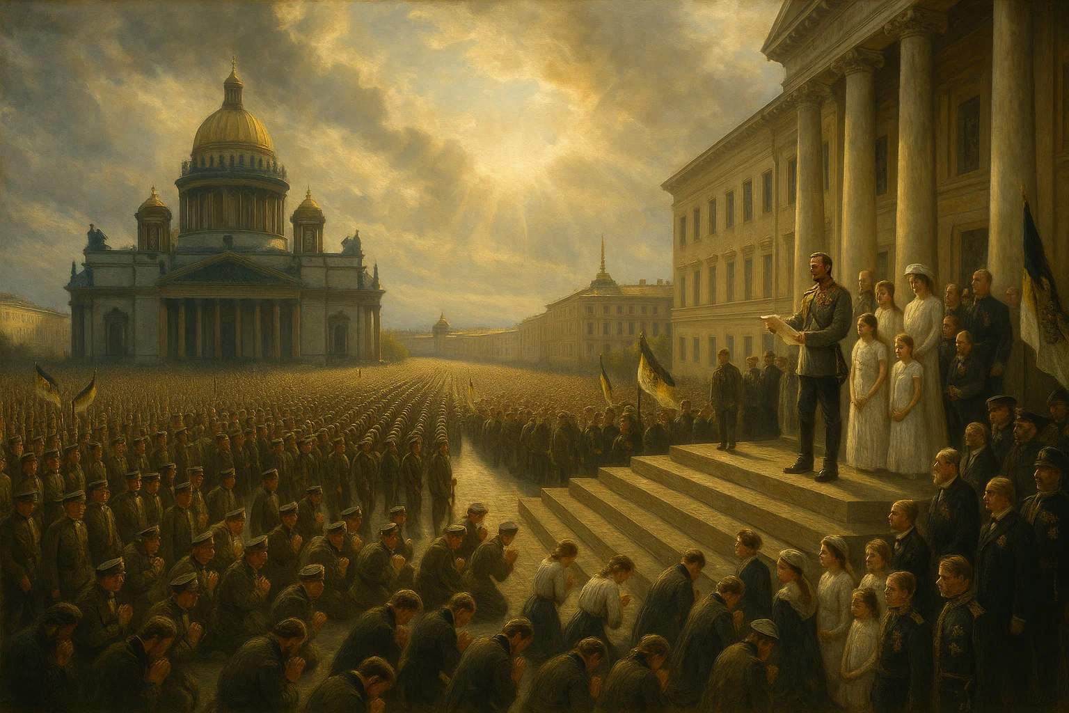3) О заводах и работе. Наши усилия уже подняли мощности губернских заводов с двадцати до сорока процентов, а к декабрю мы уверенно идём к шестидесяти. Заказы казны уже превысили сто пятьдесят миллионов рублей: двенадцать миллионов на оружие, пятьдесят на боеприпасы, тридцать на металл, сорок на транспорт, восемнадцать на обмундирование. Мы освободили предприятия от налогов на полгода, ввели кредиты под четыре процента, и в цеха уже вернулось более тысячи инженеров и мастеров; к концу осени их будет не менее пяти тысяч. Для рабочих и крестьян уже выданы дополнительные карточки на двести тысяч семей мобилизованных. В уездах идёт программа общественных работ — двадцать тысяч мест; платим по два рубля в день и выдаём хлеб. Пятьдесят медицинских бригад уже отправлены в деревни. Семьи погибших ежемесячно получают двадцать рублей и хлебные карточки. Народ впервые за долгое время чувствует: Империя не только требует, но и заботится.