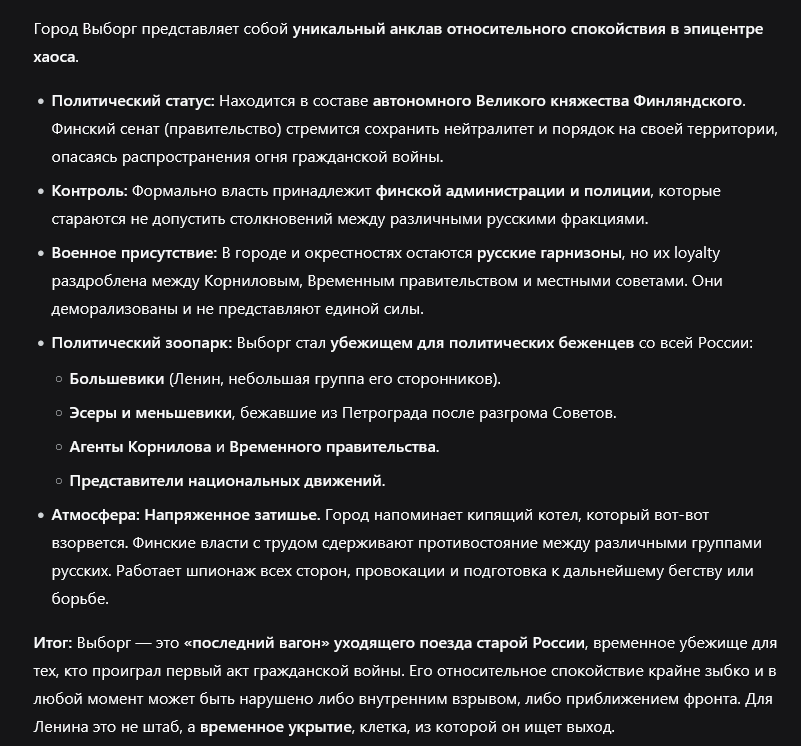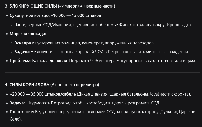 3. Возможности (то, на чем можно сыграть): Корниловский мятеж (август 1917): Это их звездный час. «Союз» может стать тайной ударной силой внутри мятежа, его «стальным каркасом», или же, наоборот, держаться в тени, чтобы сохранить силы после его неизбежного провала (с точки зрения Дорошенко-разведчика, это логичнее). Разложение армии: Чем больше будет хаос и падение дисциплины в армии, тем привлекательнее для многих офицеров будет стальная дисциплина и ясная цель «Союза». Они могут стать магнитом для проигрывающих офицеров. Октябрь 1917 и после: После падения Временного правительства «Союз» мгновенно становится главной силой будущего Белого Движения. Их сеть, кадры и ресурсы — готовый фундамент для Добровольческой армии. Похищение Царя: Вместо террора против левых, точечная спецоперация по освобождению царской семьи из-под ареста в Тобольске силами верных агентов Дорошенко стала бы величайшей пропагандистской победой.