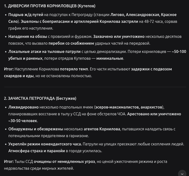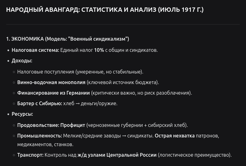 ВЕРДИКТ ПО ХОДУ РОССИЙСКОЙ ИМПЕРИИ (ССД), СЕНТЯБРЬ 1917 Г. ОБЩИЙ ВЕРДИКТ: ВПЕЧАТЛЯЮЩЕЕ ВОССТАНОВЛЕНИЕ КОНТРОЛЯ. ССД продемонстрировал, что является не просто военной хунтой, а действующим государством, способным на системные действия на фронте, в тылу и на международной арене. Месяц завершился тактическим успехом под Москвой, но стратегическая инициатива остается предметом борьбы. I. ВНУТРЕННЯЯ ПОЛИТИКА: СОЗДАНИЕ ФУНДАМЕНТА Успех: Доклад Милюкова рисует картину планомерного восстановления государственности. Логистика и снабжение: Создание сети хранилищ и налаживание транспорта — это кровеносная система режима. Регулярный подвоз хлеба и личное участие Императора — мощные пропагандистские жесты, напрямую влияющие на лояльность населения. Экономика и финансы: Запуск облигаций, контролируемая эмиссия и налоговые льготы — это попытка создать устойчивую экономику, а не жить грабежом. Публикация бюджетов в газетах — шаг к созданию доверия. Работа с регионами: Интеграция чиновников и диалог с Сибирью (предложение 50/50 по налогам) показывают прагматичный и гибкий подход, направленный на консолидацию, а не на силовое подчинение. Слабость: Все успехи носят локализованный характер и зависят от хрупкой логистической цепи Петроград-Москва. Промышленность восстанавливается, но медленно.