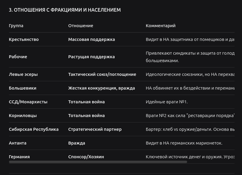 УТОЧНЕНИЯ ПО ВОПРОСАМ ИГРОКА Бронепоезд: Да, к концу сентября создан ОДИН импровизированный бронепоезд, «Сибирский Медведь». Это паровоз, защищённый стальными листами и мешками с песком, с установленными пулемётами и одной лёгкой пушкой. Экипаж — добровольцы ЖД корпуса. Пока это символ, а не реальная сила, но он уже патрулирует участок near Великосибирска, поднимая дух. Действия партизан: Партизаны-староверы не ведут открытых боёв. Их действия: Диверсии: Подрыв мостов, повреждение путей на участках, контролируемых Семёновым. Засады: Нападения на мелкие обозы и курьеров. Пропаганда: Распространение листовок Мартынова в сёлах. Эффект: Семёнов вынужден отвлекать силы на охрану тыла, его снабжение ухудшается.