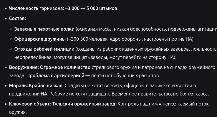 II. ВОЕННЫЕ ДЕЙСТВИЯ: ПРОФЕССИОНАЛИЗМ ПРОТИВ ЧИСЛА Блестящая тактическая операция: Генерал Келлер провел классическую наступательную операцию маневренной армией против численно превосходящего, но менее организованного противника. Концентрация сил и логистика: Создание корпуса «Север» и контроль над ключевыми станциями — образцово. Использование момента: Удар по НА в момент его дезорганизации после пожара был идеально рассчитан и исполнен. Возвращение Кремля и части Москвы — это морально-политическая победа огромной значимости. «Голосари»: Создание пропагандистских и идеологических частей — инновация, которая работает на укрепление тыла и морального духа. Стратегические риски: Завязли в Москве: Элитные части ССД втянулись в затяжные уличные бои, где преимущество начинает смещаться в сторону более многочисленного противника. Штурм Тулы: Бои идут тяжело. Даже в случае успеха, ССД получит разрушенный завод и еще более растянет свои ограниченные силы. Война на истощение: ССД воюет качеством против количества. Каждый потерянный офицер или ветеран — невосполнимая утрата.