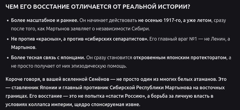 Его успехи локальны, но важны: они мешают Семёнову закрепить иностранную опору и дают шанс для формирования «сибирско-имперского» фронта обороны. В дальнейшем по вопросам - обращаться в ставку.