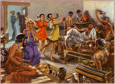 Мужчины, тем временем, залились громким смехом и ударили с Лено по рукам. Первый мужчина лежал небрежно, опершись на подушку. На груди была расстёгнута туника, запястья были в золотых браслетах, глаза масляно-ленивые. Когда рабыня налила ему вина, он сжал её бедро ладонью и с силой провел у нее между ног, усмехнувшись, глядя, как та смущённо опускает глаза. Он ел глазами всё, что двигалось - и определенно был весьма похотлив.