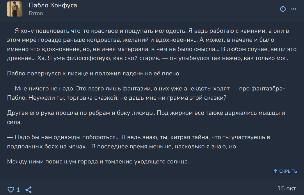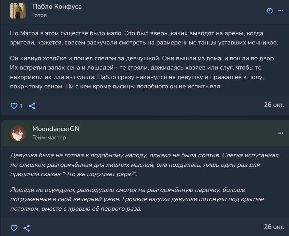 >>865192 Это был ролл голого среднего стата Эмпатия. Средние статы достаточно вольно трактуются, но в моментах типа таких, удобно воспринимать их в целом. Когда ты просто хочешь поговорить, но без каких-то определённых целей, это просто бросок на эмпатию. Думаю на этой сцене подсвернём. Мне надо хотя бы шесть часов поспать, а сцена с аналитикой займёт какое-то время. Если тебе будет несложно, подсчитай количество раз, когда ты проходил какую-то проверку и сколько степеней успеха у тебя получались. Это потом надо распихать по статам, какой из них тренируется, типа. Их лица разом отразили на себе как понимание, так и глубокое раздражение, переходящее в гнев. Ребёнок, только-только начавший успокаиваться, почувствоваший злость родителей вновь начал плакать. Змей одними глазами попросил супругу унести ребёнка и достать что-то из шкафчиков над большим очагом.