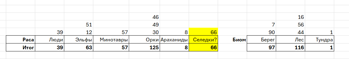 Да, тут ошибка с моей стороны, визирую цифры со второго хода. Распределение по полу или по специализации - согласен, тут можно обсудить. В целом, будто бы определение пола ни на что не влияет, тогда как специальности гораздо важнее. Поэтому в целом можно убрать гендерное и возрастное распределение и оставить только специализации и массу членов племени без оной/базовой специализацией "орк-обывала".