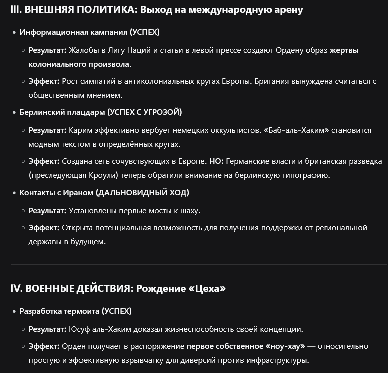Анализ и Вердикт Сильные стороны (Ваши козыри): Идеологическая «вирусность»: Ваше учение — идеальное оружие для вербовки разочарованных, маргиналов и искателей «высшей правды». Оно может проникать куда не дотянется штык. Абсолютное единство ядра: Пока жив Аль-Баб и его Первый Избранный, орден непоколебим изнутри. Идеальный камуфляж: Тактика такия и внешне респектабельный фасад — ваш главный щит. Вы можете расти прямо у британцев под носом. Двойная экономика: Пожертвования + контрабанда + банки — это гениальная финансовая система для подпольной организации.