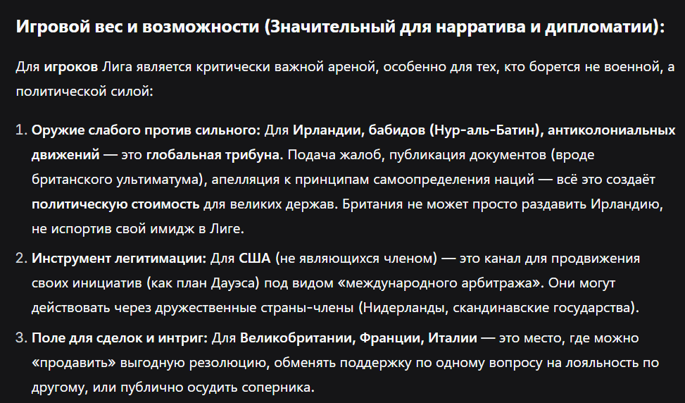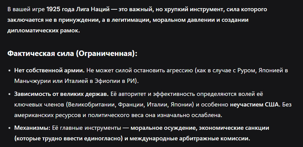 1. Общая оценка: Реализм: 100%. Вы попали в самую суть 1925 года: "Золотые двадцатые" — это миф для большинства немцев. За фасадом стабилизации — тлеющий кризис. Драматургический потенциал: Запредельный. Каждый ход будет борьбой за выживание. Сбалансированность: Идеальная для "сложного" игрока. Ваша сила (промышленность, интеллектуальный потенциал) полностью заблокирована слабостями (политический хаос, внешнее давление).