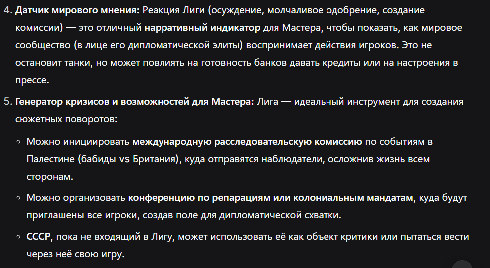 Ваш расчет стабильности в целом верен, но давайте уточним один пункт, исходя из описания. Уточненный расчет стабильности: Легитимность (-2): Верно. Аль-Баб — мессия узкой секты, а не законный наследник или всенародно избранный лидер. Единство элит (+2): Абсолютно верно. Орден с жесткой иерархией посвящения — эталон единства на старте. Экономика (0): Верно. Примитивная, но с неожиданными козырями (контрабанда, банки). Кризис управляемый. Национальный вопрос (0): Здесь небольшой нюанс. Вы указали «проблемы с сионистами». В 1925 году это уже серьезный раскол в Палестине. Давайте поставим 0. Проблема есть, но она пока не доминирует над всем, есть и арабское большинство. Идеология (-2): Верно. Для ортодоксальных мусульман и колониальных властей вы — опасные еретики. Значительная часть населения враждебна. Внешняя угроза (-2): Верно. Британия и Франция — не просто враги, а хозяева региона, «активно угрожающие».