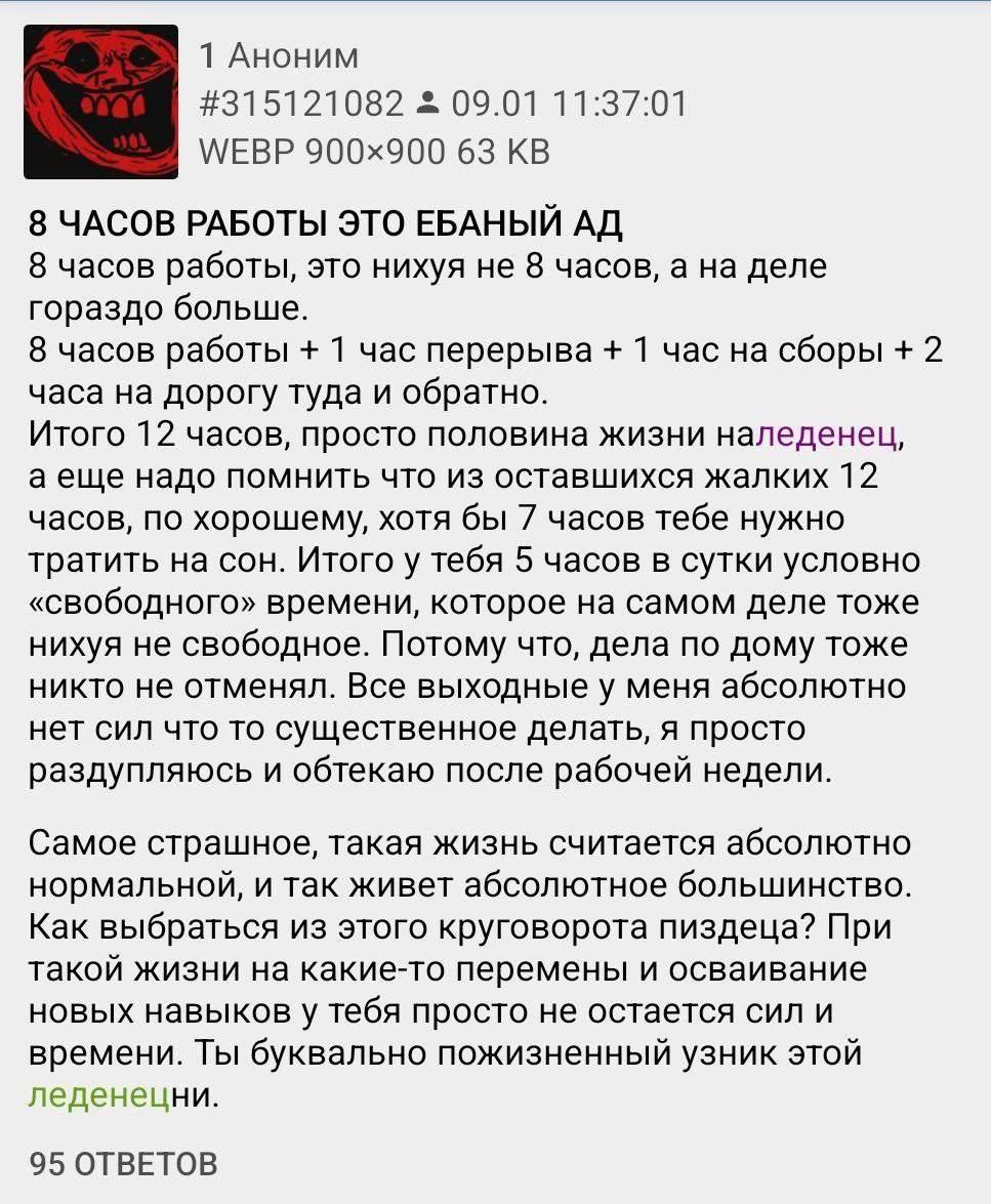 Кун 30 левл. Живу в Расчленёнграде и работаю подсобником в автоколонне за примерно 80к. Казалось бы и бабки неплохие и работа возле дома. Но как же меня в депрессию вгоняет местный контингент. Быдло на быдле в том числе и начальство. Да и сама работа неоднозначная. Вроде можно иногда и весь день проебланить в курилке, что тоже не хорошо ибо время не идёт от слова совсем, а можно и так заебаться что потом не отмыться и не разогнуться, со смены тупо уползаешь. Главный минус это грязь. везде ебучая грязь. А ещё иногда надо из машины с мусором перекидывать в другую машину этот самый мусор. Кузов у неё маленький, а я большой и мусора до верху. И ползает там всякое. Вы когда нибудь сражались с злокрысом ИРЛ, а вот я сражался, блджад. Плюс этот ебаный 5/2 .Предыдущая работа была заебись сутки через трое за 30к и ламповый пенсионерский коллектив из творческой интеллигенции доживающих свой век, но из-за облав на пушечное мясо пришлось от туда слинять. Короче заебался я, а куда валить хз. Надо бы и близко к дому и хотя бы 50к и в чистоте. Но вот только я крайне плох в общении и практически не обучаем, разве что с каким-нибудь наставником у которого есть опыт работы с дебилами. Поглядывал на выдавальщиком на озоне, но чёт говорят зарплаты по 20к. На биржу идти чёт сыкотно припашут какие-нибудь дроны клипать или контракт подписывать. Плюс они особо и не спрашивают чё ты хочешь чё ты можешь вкидывают, что скопилось. Не знаете агентства по трудоустройству рабоют или тоже прогрев гоев?