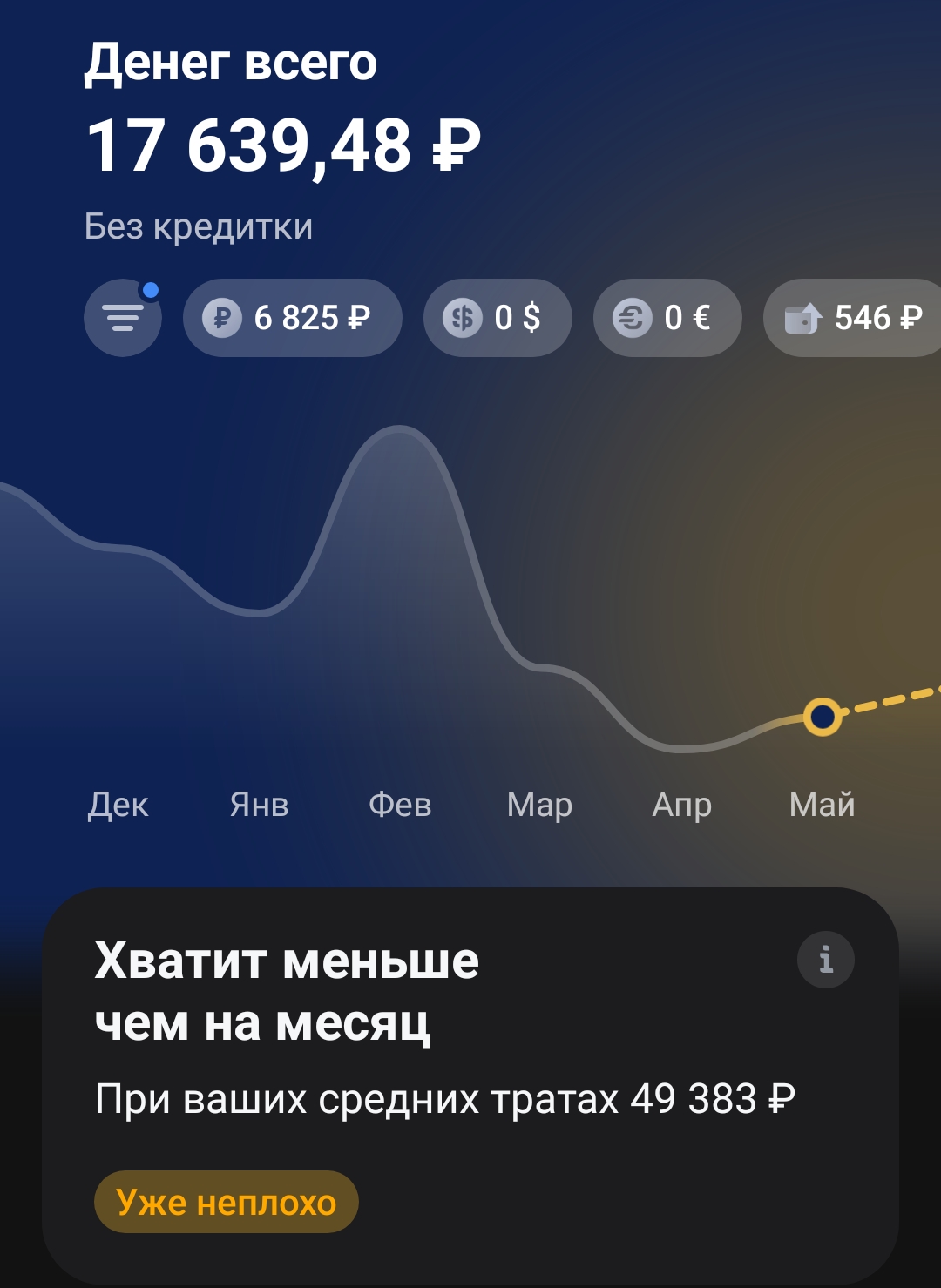 Ну в принципе я пока не сдох. Хз откуда он 17к нарисовал, в реальности я сейчас в минусе на 325 рублей и живу по кредитке с лимитом 15к, из которых 11 уже проел