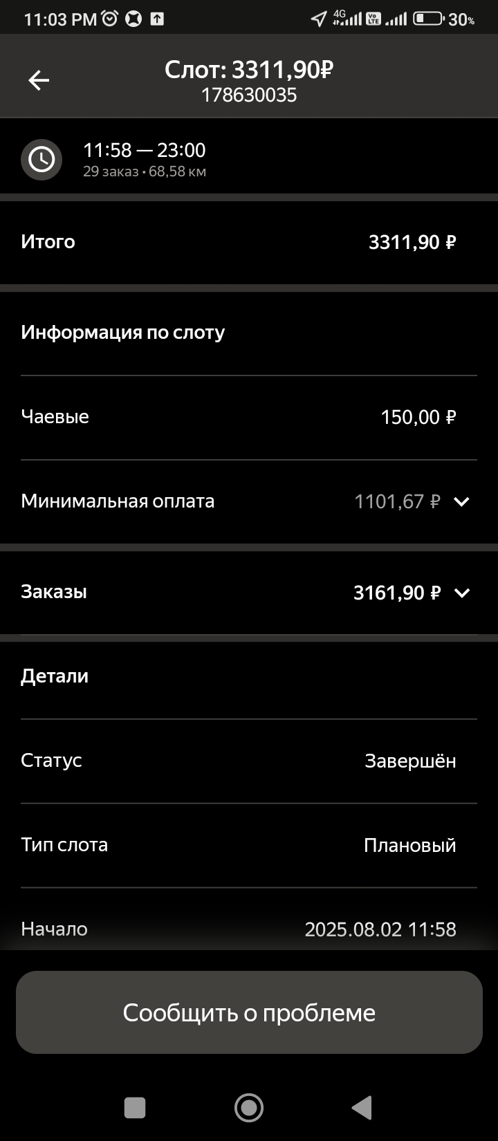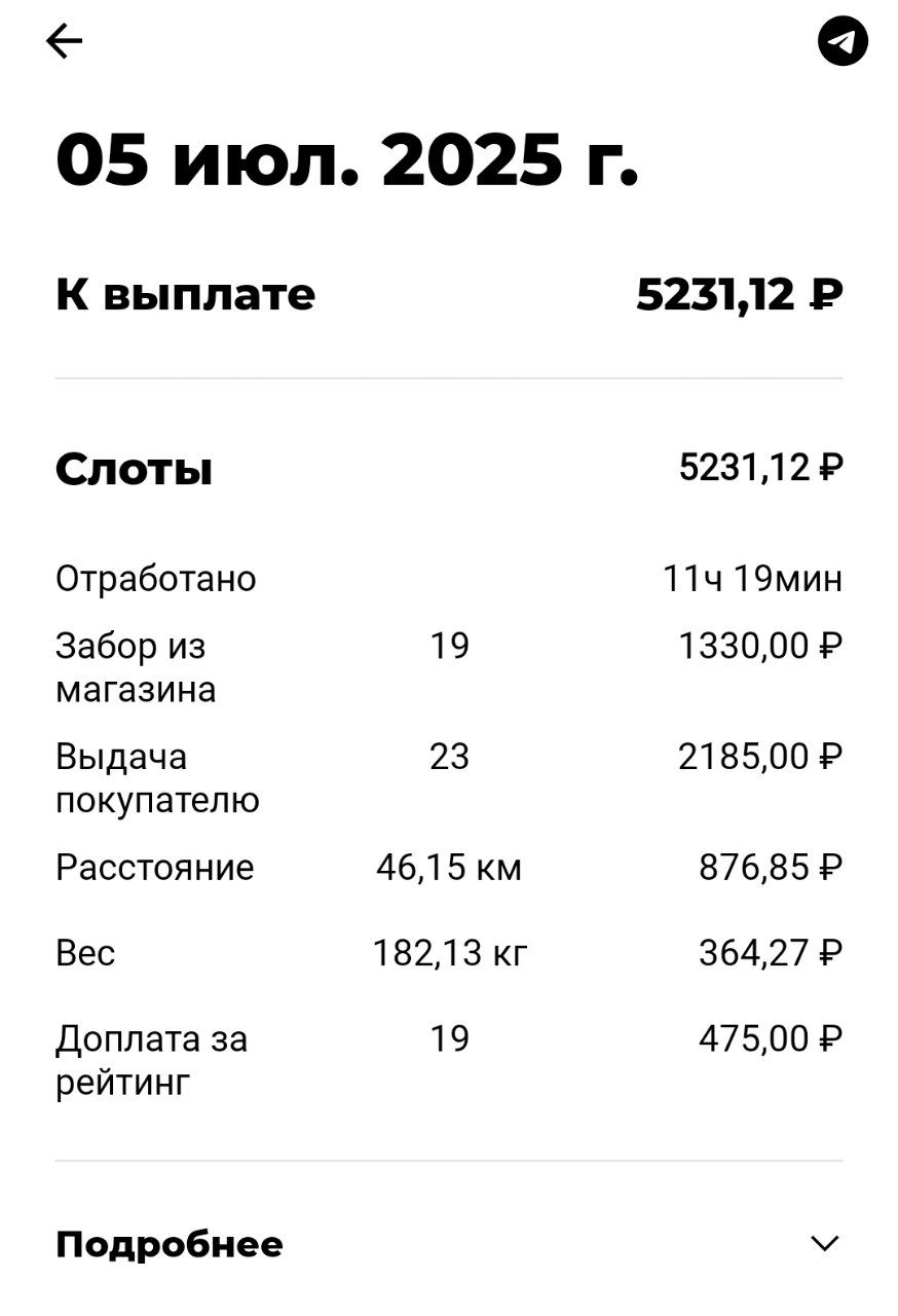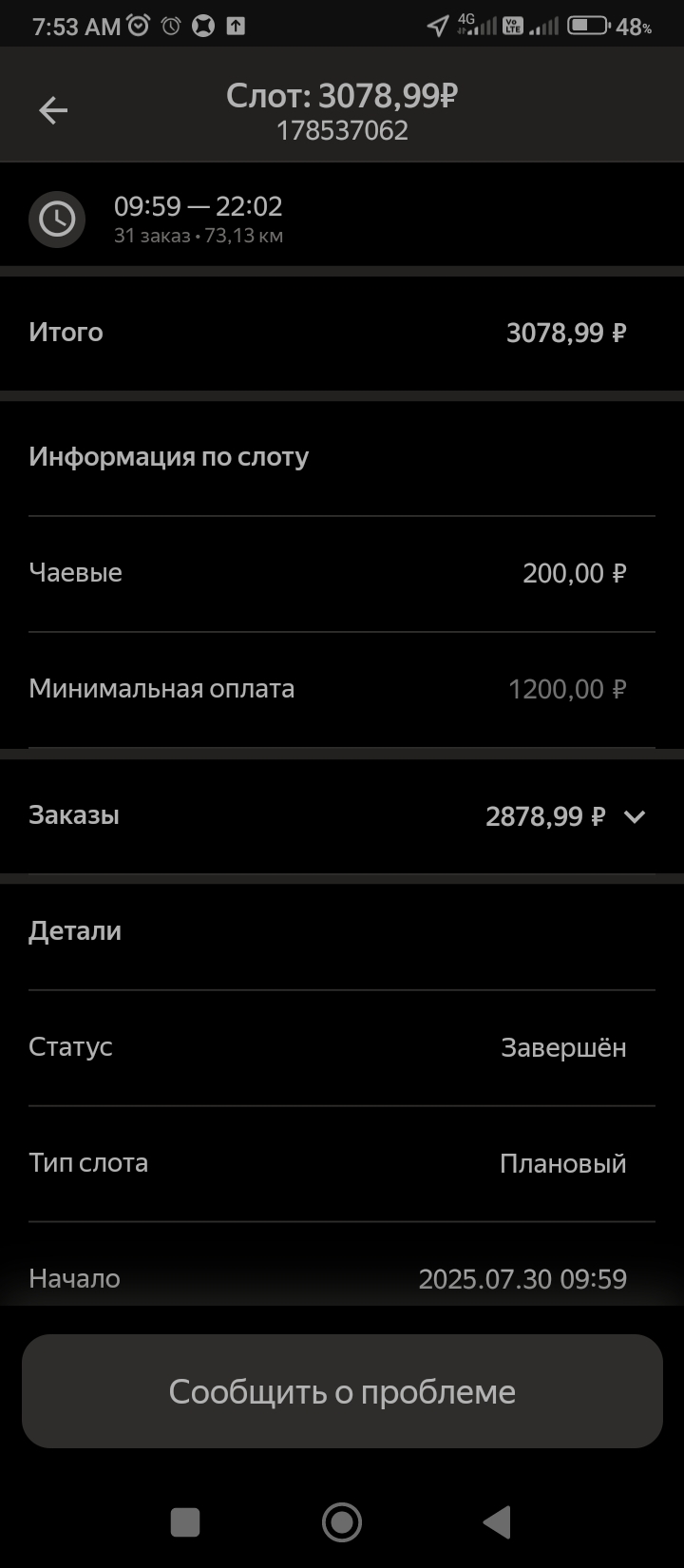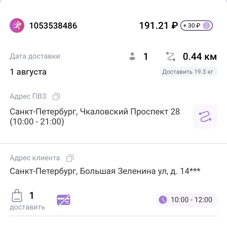 >>3137778 Всё те же 200р в час, +/-. После последнего заказа слота посидел помониторил заказ по пути домой, вообще это конечно тупо что нельзя до окончания слота это делать. Заодно чуть экспанулся в ручном наборе. В общем нашёл один, приехал на первую точку, а там выяснилось что заказ надо было забрать до 15:30, а в инфе заказа этого нет. Минут 40 минусанул за компенсацию в сотку, ну хоть не 0. Хотел уже в холостую ехать домой, как на остановке в 3 минутах появился заказ почти до дома, повезло.