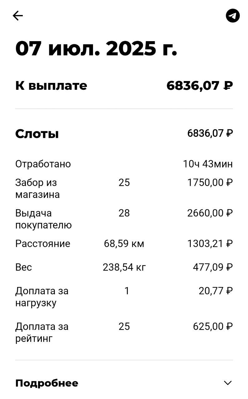 >>3158118 Стоимость заказа формируется из забора из магаза 70р + выдачи 95р + 2р/кг за вес и 16-22р/км за пробег (зависит от вело/авто). Это для ДС и поддсья Количество как повезет и смотря где ты и на каком статусе и как быстро заказы будут собираться. Я на тачке из даркстора делал 20зз за 12ч слот, в другом районе из перекрестка 35зз. В сезон можно и 50 в день Фиксы нет, есть гарантия для 12ч слотов , там доплачивают до 15/20зз (вело/авто) если их меньше Слоты выкатывают для всех во вторник, кто первым забрал тот и работает Если слотов нет, выходишь на свободный слот, биржа называется. И тебе прилетают заказы со всех магазов около тебя Заказы назначает прога Из минусов тяжести приходится таскать, особенно на автостатусе и условия за лето ухудшились - порезали таймеры, ввели подмену номеров клиентов, проверку прибытия через номера готовых заказов, кур стало многовато