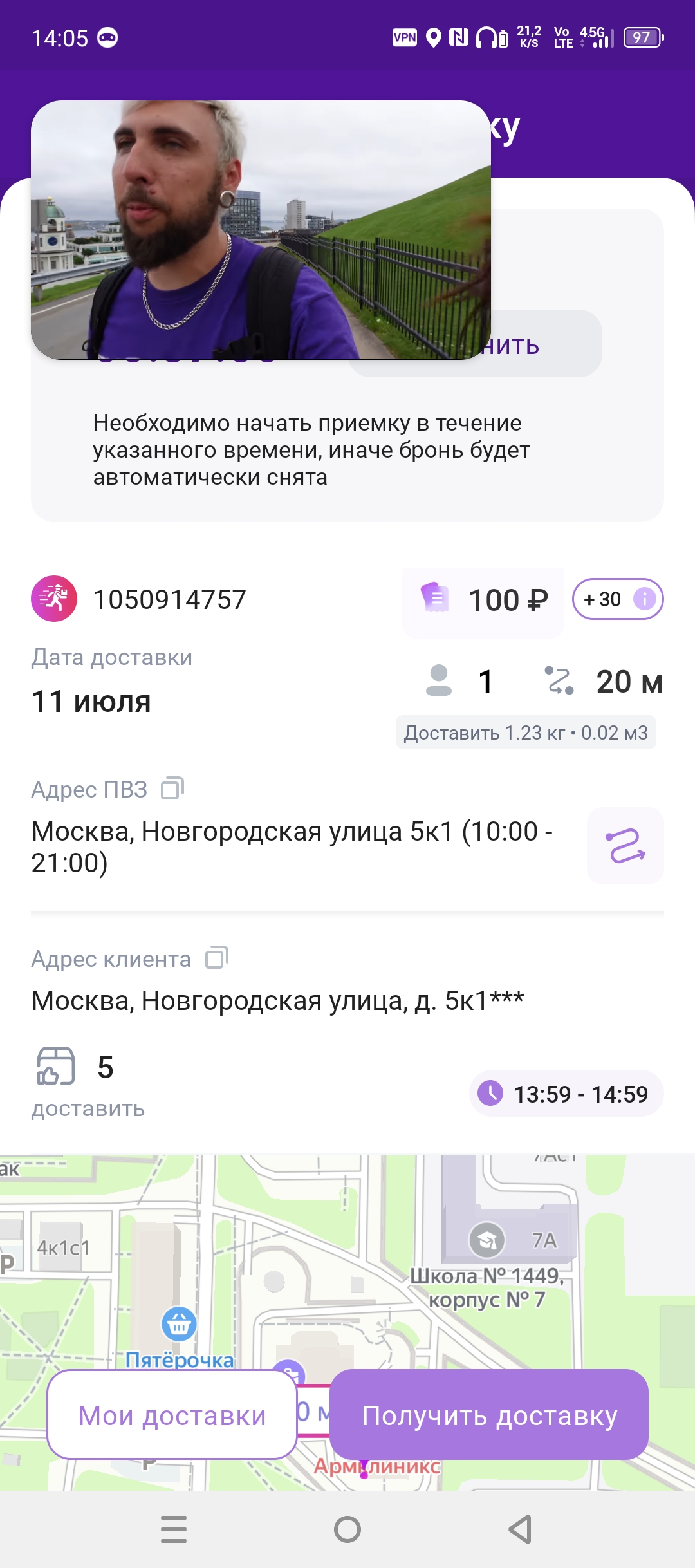 >>3139510 От момента нажатия кнопки заказа курьера до момента появления заказа на карте проходит несколько минут, примерно 5-8, там обновление новых заказов не мгновенное.
