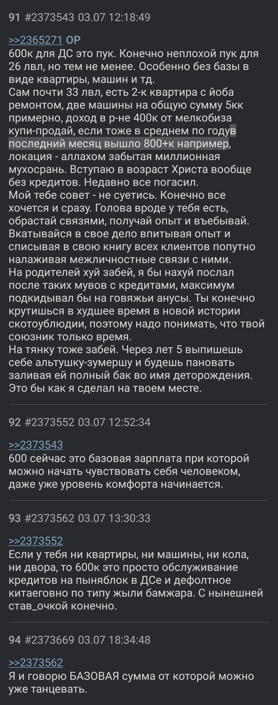 >>3155094 Днари, я щас открою вам секрет, но помимо днарей и олигархов в великой и могучей существует и третий тип людишек - тот самый средний класс, "нормальный" тип. Гораздо хрупче и слабее чем в америке и прочем первом мире, но он у нас всё таки есть. В эту категорию входят +- успешные ипшники, маленькие-средние кабанчики и сумевшие реализовать себя суперспецы. Их гораздо больше чем вы думаете, наличие одного такого на дваче - совсем не редкость. (Особенно когда тут по соседству находится тред строителей где по ощущениям каждый второй зарабатывает полляма в месяц минимум) Скорее всего чувак не пиздит и с его перспективы 600к - реально копейки