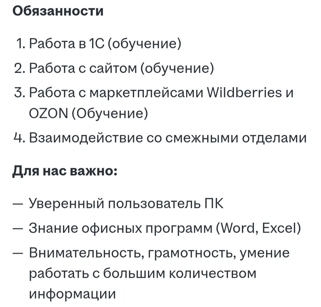 >>3156119 > Ответь на мои вопросы. Как вкатился, Случайно. Заходил как оператор пк / оператор 1с в отдел продаж ООО не связанной с маркетплейсами. Хорошо поработал 3 месяца, накинули обязанностей ассистента руководителя (в основном мелкая операционка, уже и для маркетплейсов), потом плавно ввели в маркетплейсы и честный знак, через 6 месяцев отдали кабинет на озоне под управление. Я быстро схватывал и хорошо работал. Сейчас веду 2,5 кабинета на ВБ и 1 на Озон.