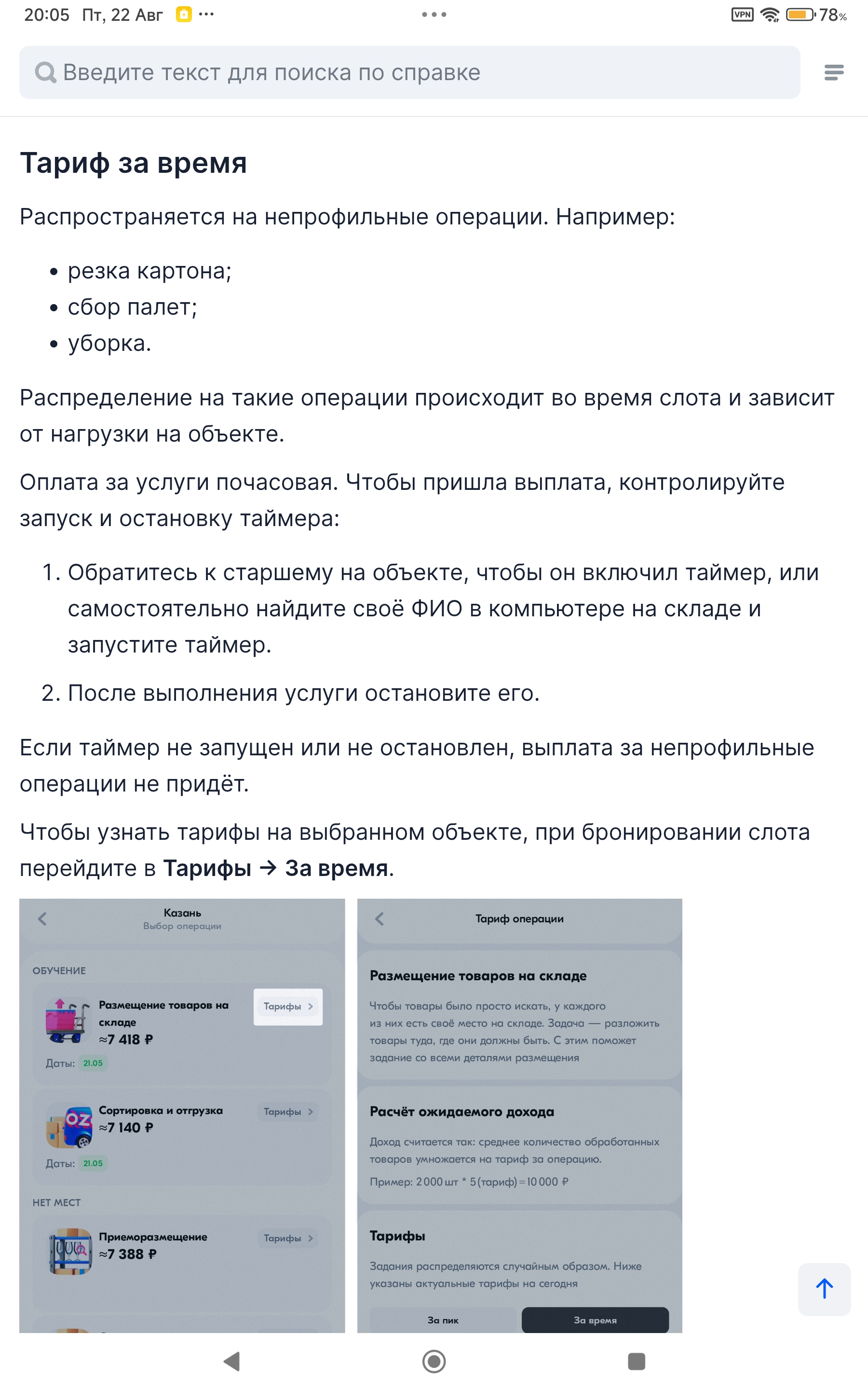 Здравствуйте! Я записался на слот Озон Джоб для работы на профильной операции (пикать), но пикать начал только после 16:00. До этого по указанию бригадира занимался выполнением непрофильных операций — резал картон, убирал, собирал паллеты, катал в ячейки мобильные контейнеры... Мог ли я по согласованию с бригадиром включать таймер для учёта времени на непрофильные операции и получать за них оплату? А когда начинаю пикать, можно ли остановить этот таймер? На скрине инфа с так называемой "базы знаний"