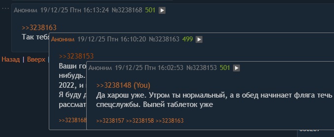 Кстати о птичках, касаемо вот этих тонких токсов изъёбистых и женских, я помню, например, и другого рода такие истории. Как, например, сюда кидались отсылки на мои старые дневники для кринжтроллинга, однако понятно, что это было параллельно псевдопушу меня во власть, что как бы спасало в краткосрочной топике и работало как компенсация, достаточно искусный троллинг, если не учитывать то, что пуш меня во власть был троллингом, а ещё это было отсылкой к Димитровой из 2019, чья голова была взломана ещё до того, как она попала в конфу, особенно учитывая то, что у Яна появилась девушка Саша из Ярославля какого-то хуя. Искусно, но хули толку. Есть ещё более искусный контекст, за движения в котором у вас мозгов не хватит поди, да и вы в принципе в беспамятстве, судя по противоречиям на протяжении всего этого времени. Очень искусное изображение искусного троллинга в контексте гораздо более сложном, в котором вы сами видать были карикатурами на кого-то из прошлого а контексте, какой поискуснее вашей на коленке придуманной хуетене, важной только в актуале. Всё это под трупы из новостей, под которые вы не поправлялись, как не поправлялись и в принципе под информацию из объективной реальности, какая неоднократно сигналила, что стоило бы прекратить.