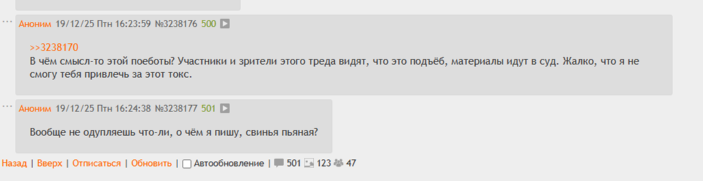 Так что буду выёбываться преимущественно в суде, пока что нет смысла. Поэтому и написал, что жалко, что не смогу тебя привлечь за один этот токс. Потому что система работает не так, что можно привлечь человека так, чтобы урон был оценен объективно, а наказание было бы справедливо. Вообще, я бы на твоём месте не выёбывался, учитывая то, что, если Скалли Милано делал отсылки на меня в конце 2022, то я, если честно, не вижу, где ты хозяин своей жизни.