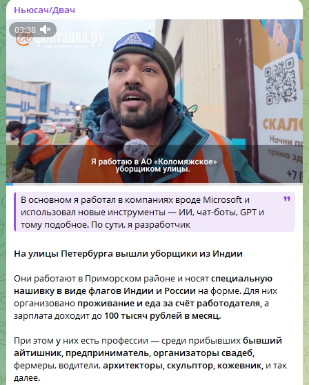 В Питер завезли симпатичных индийцев-дворников. Они как белые, только черные. Лица вдумчивые, такие, если сообразят и не привередливые, как русские, найдут тут себе одиноких баб с хатой и нормально заживут.
