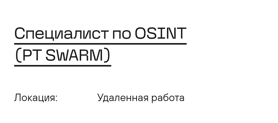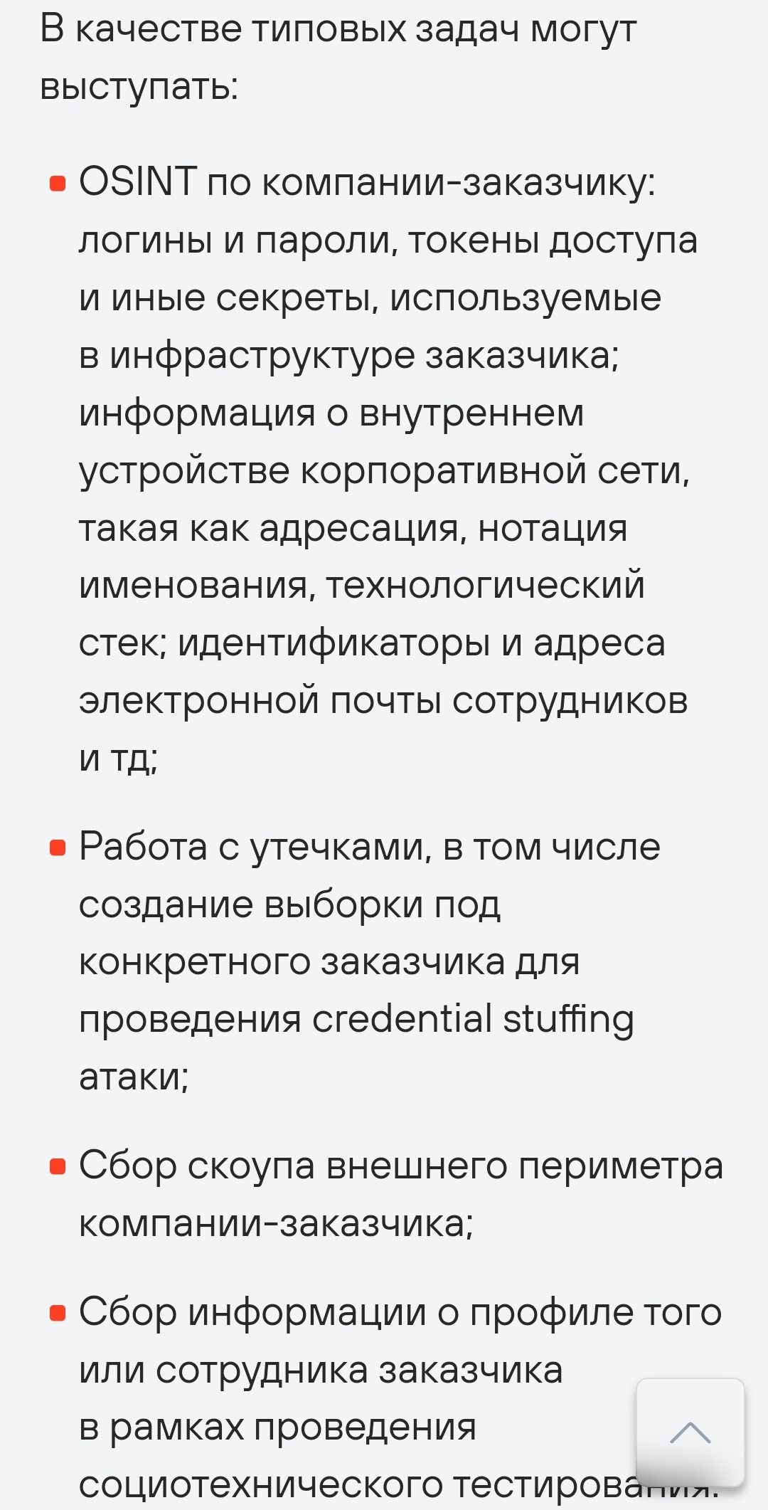 Требования: Понимание сути проведения OSINT-мероприятий, умение строить длинные цепочки рассуждений и творческий подход к задаче, а не только следование стандартному чеклисту проверок; Опыт работы с сервисами и инструментами для поиска информации: понимание отличия "site:" от "inurl:", как по фото найти страничку в соц. сети и что делать, если Github не дает искать учетки от contoso.com; Умение анализировать большие объемы данных (текст, изображения, веб-страницы, базы данных, etc), отсутствие страха работы с неструктурированными данными; Понимание где достать базу данных, об утечке которой 5 минут назад написали на xakep.ru; Способность автоматизировать простую рутину, например, используя powershell или python; Технический английский. Задачи: Вы будете работать в команде по проведению тестов на проникновение, оказывать поддержку разведкой по открытым источникам коллегам-пентестерам при проведении проектов по внешнему и внутреннему тестированию на проникновение, непрерывному тестированию на проникновение (Pentest365), redteam-работах, проектах, связанных с социотехнической инженерией.