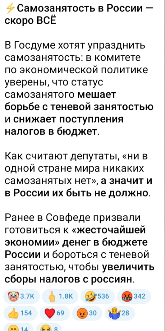 >>3084209 Такси - это самозанятость, предпринимательство. Также, как у ИПшников, владельцев бизнеса нет отпусков по графику, они их планируют сами и за свой счет. Никто не запрещает работать как ИП, будет идти пенсия и трудовой стаж. В ДС многие активно работающие будут вынуждены стать ИП, из-за превышения лимита в 2.4 млн как самозанятые.