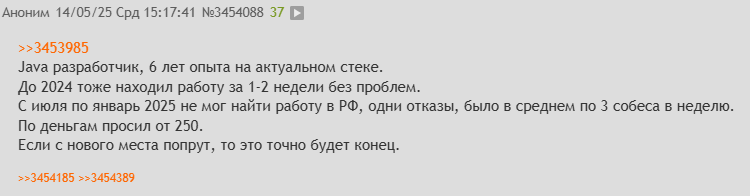 >в то время как люди с опытом в 10-20 лет, естессна, в хуй не дуют В роликах инфоцыган? Ну, я в IT с 2014 года. В ковид получал 400к, сейчас вдвое меньше.