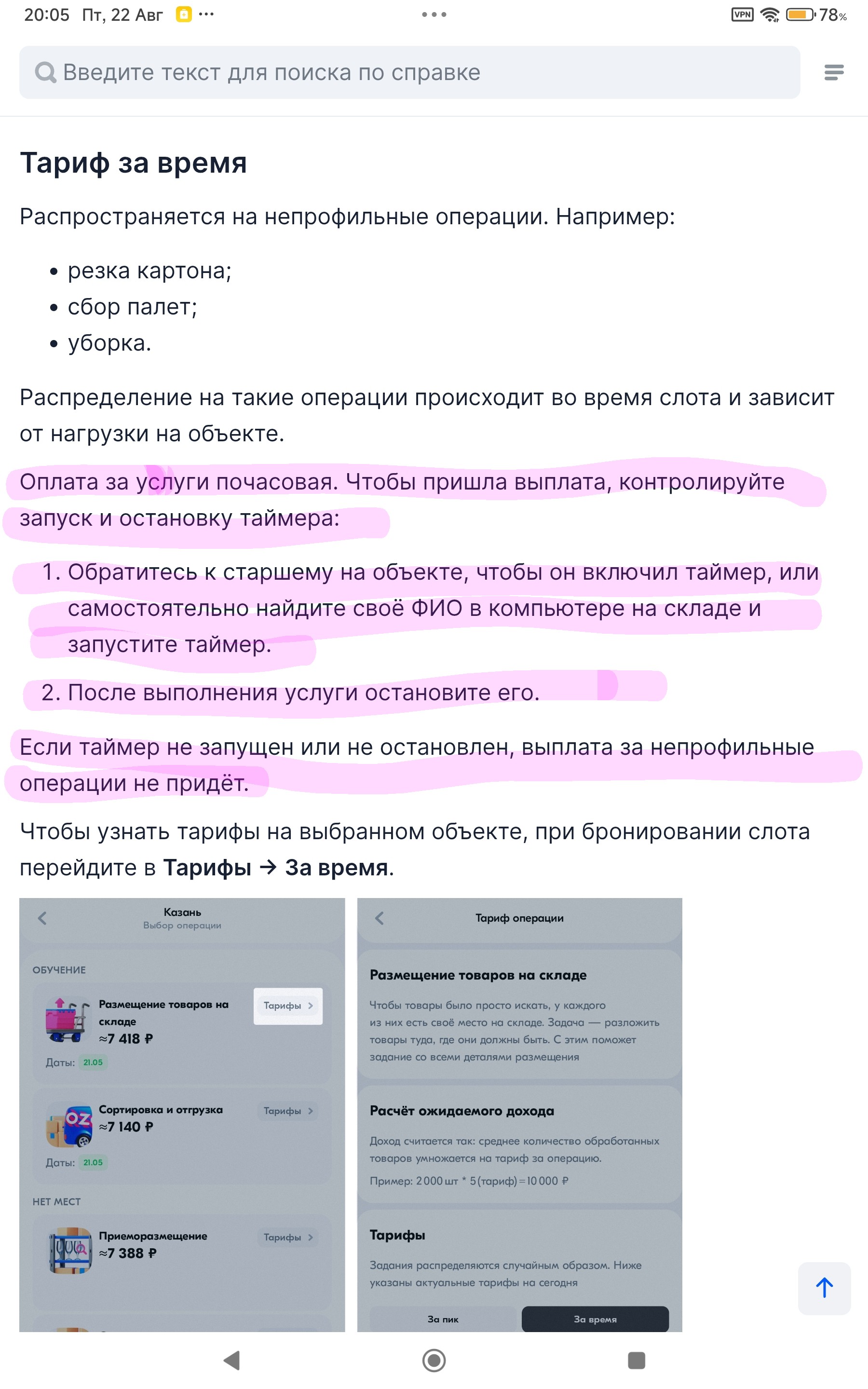 Здравствуйте! Я записался на слот Озон Джоб для работы на профильной операции (пикать), но пикать начал только после 16:00. До этого по указанию бригадира занимался выполнением непрофильных операций — резал картон, убирал, собирал паллеты, катал в ячейки мобильные контейнеры... Мог ли я по согласованию с бригадиром включать таймер для учёта времени на непрофильные операции и получать за них оплату? А когда начинаю пикать, можно ли остановить этот таймер? На скрине инфа с так называемой "базы знаний"