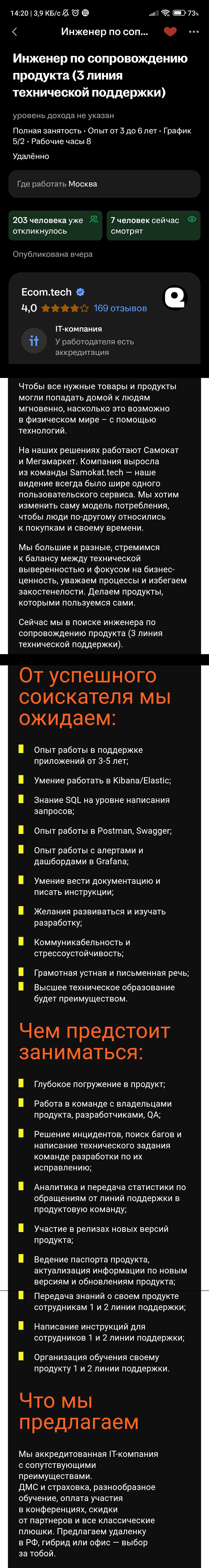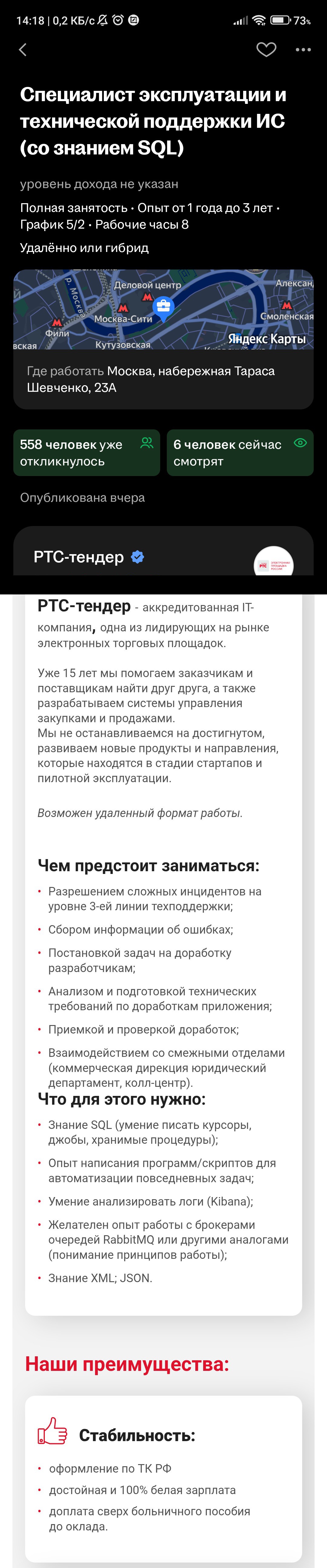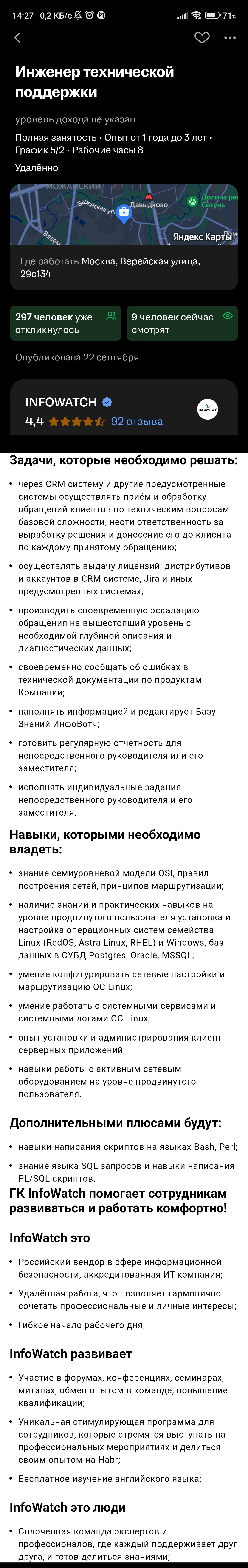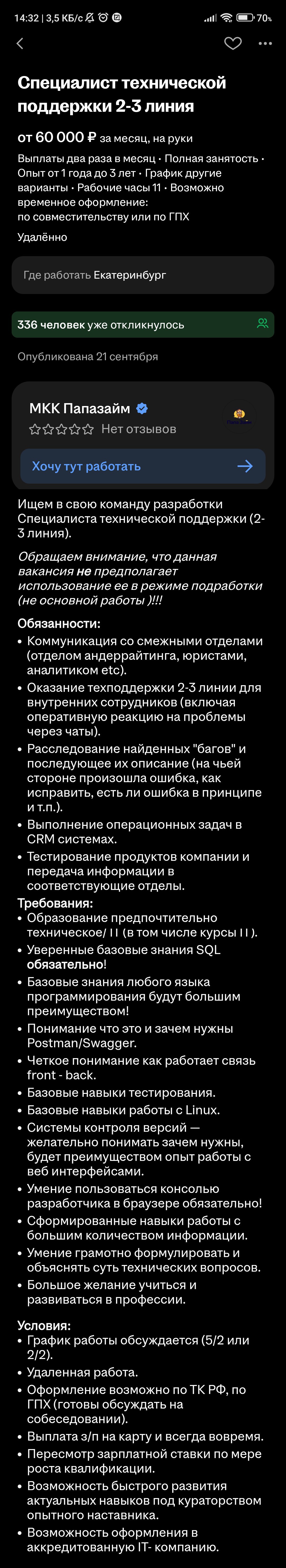 Стало анрил устроится в тех.поддержку, по 300-400 откликов на любую нищую удаленку, практически постоянно летят отказы, это при том, что у меня есть опыт, но Мухосранск настолько маленький, что очно контор куда можно пойти тупо нет, скоро придётся таким Макаром на завод спину рвать, либо на морозе яйца монтажником куда-то в телеком, видимо рыночек даже нищих техподов порешал
