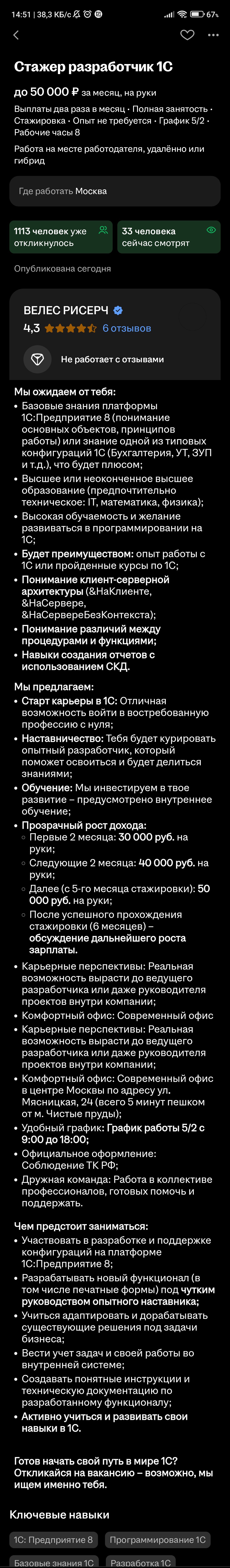 >>3185211 Да, всё. Иди в 1С в провинциальный офис, там нет откликов совсем пока что. Но потолок по зп 150-200к в лучшем случае. В Уфе, например, такая ситуация: