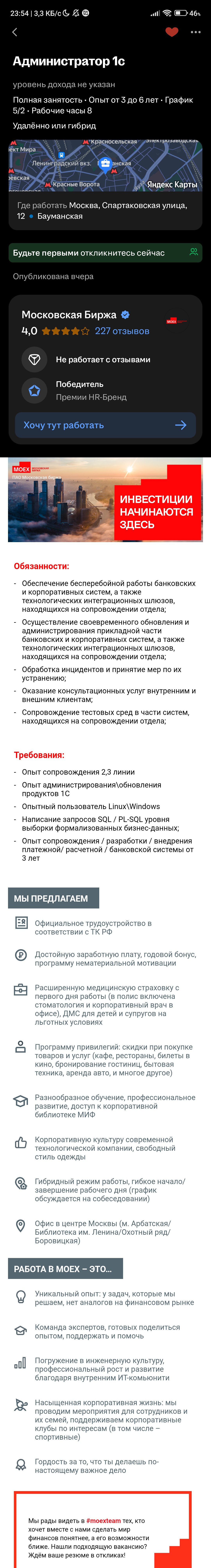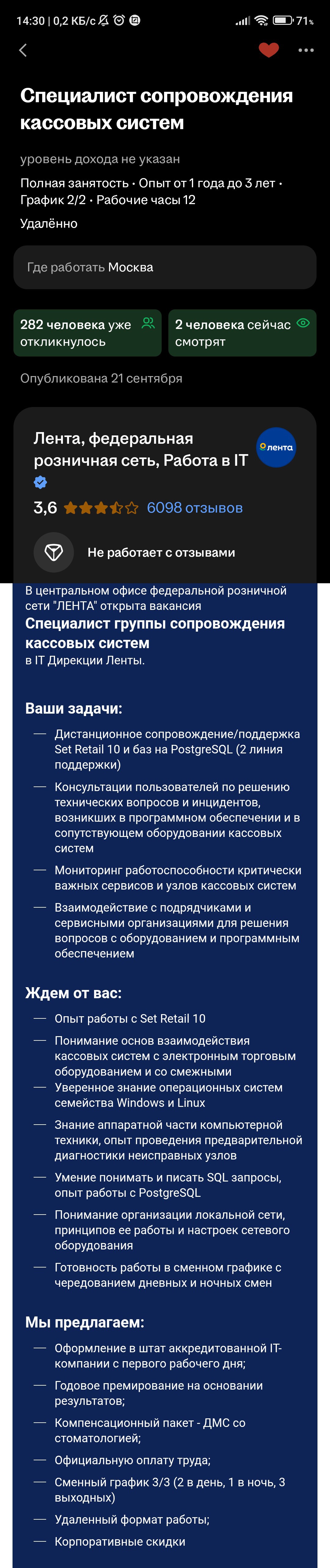 >>3186522 >Саппорт L2-L3 в ДС1 сейчас получает столько, но тенденция такая, что ЗП просели на 10-15% и возможно будут сокращения с целью замены нынешних сотрудников на более дешевых. Понятно, ну у нас в целом тоже сокращения идут, но наше руководство задефало конкретно наш департамент от сокращений. >Как в любом Биг Техе - все зависит от стрима (команды). попадешь в хорошую команду получишь пересмотр грейда и ЗП раз в пол года - год. Ну в общем звучит так, что игра не стоит свеч без смены должности, с учетом, что меня на моем месте не устраивает исключительно зп, а в бигтехе с твоих слов разница в зп с моей - копеечная. >Можешь сам зайти на туже ХыХу и посмотреть вакансии с требованиями. Да я и смотрел, просто звучит как-то все складно и у меня ощущение, что я не вижу подводных камней. > потыкай дома, вдруг окажется, что не твое. Так а смысл мне дома тыкать, если я прямо сейчас это делаю на 6 боевых базах. Опять же, повторюсь, я думал что есть какие-то подводные камни и на деле в этом админстве я делаю самый мизер, а сейчас получается так, что это чуть ли не все, что и должен админ 1С делать. Просто у меня диссонанс с того, что накатить конфиг на базу, предварительно забекапив её это же не сложнее, что любую прогу на компьюктер поставить.