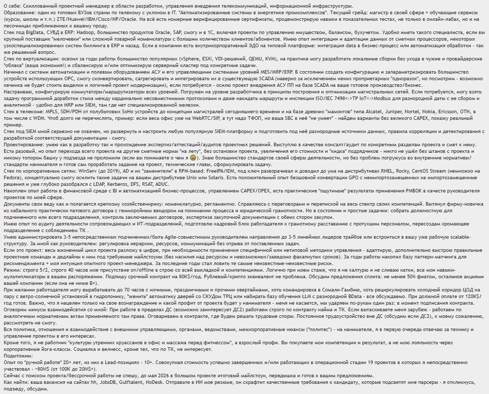 >>3210858 там сидит выпускник вуза, хорошо освоивший промптинг в чатгпт, и накрутивший 10 лет опыта, бля буду в одной голове один человек не может столько уместить, только если он не подопытный илона маска