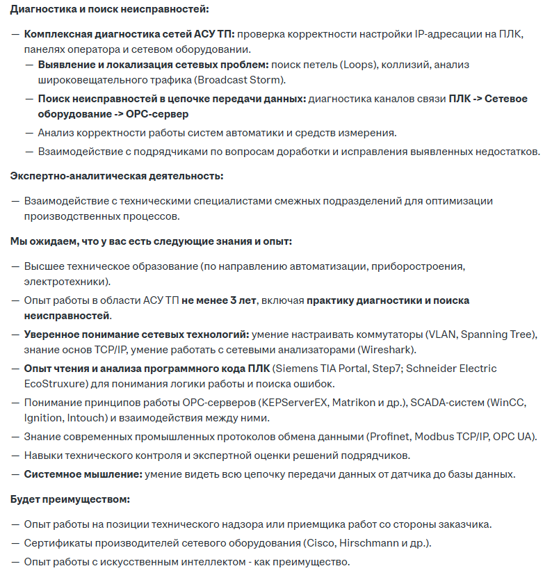 Вот, кстати, требования вроде бы на АСУшника в эксплуатацию, но по факту на матёрого сисадмина. Это я к тому чтобы у всяких додиков "с завода" не было иллюзий вката в профессию с опытом протирки датчиков и подключения частотников.