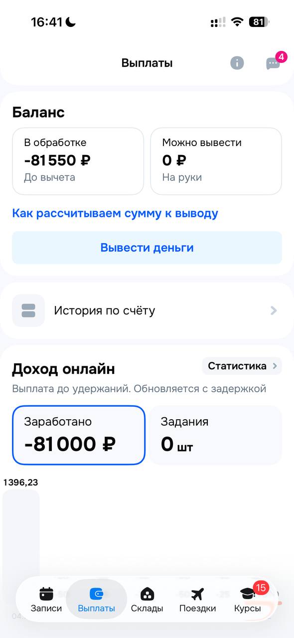 Q)А по выплатам что? А)В отличии от Озона, заработанная сумма в приложении показывается уже за вычетом налога. Но есть нюанс: в приложении есть две плашки Тарификатор и Баланс. После смены деньги идут в Тарификатор и лежат там 2 дня. В течении этих 2 дней с Тарификатора могут вычитать штрафы. На 3 день все что осталось от ваших денег за вычетом штрафов переходит в плашку Баланс. Баланс уже является неприкосновенным и из него ничего не вычитают. Дальше можете либо копить деньги на Балансе, либо вывести их на карту почти любого банка там большой список банков. Можно выводить деньги по сбп.