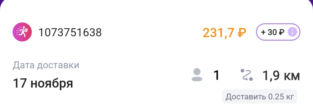 Ну что, сегодня погонял покурьерил первый день пешим кружочкодавом. До этого нигде не быкокнутился. Вроде норм, 320 рублей в час где-то выносил. Холод не мешал, подштаники, кофта и зимние ботинки, -3 градуса, город полумиллионник. Все везде пиздец добрые, какие-то гирляндочки, скрабики, да игры настольные детские. Одному мужику свитер нёс, но он так, бирку глянул, примерять не стал, забрал. Бывало, на телефон не отвечали, 3/9 заказов не дозвонился, но идти до них было по 3-4 минуты, домофоны и хаты уже норм открывали, так что за 9 ходок ни одного возврата или брака. Тянки на пунктах добрые, улыбаются, пакеты сами дают по несколько штук. Из проблем - поясница на третий час начал млеть, ибо протрузан давнишний, но млеть начала не из-за веса носимого, а потому шо на ногах долго, а моя основная работа сидячепердячая. Вторая проблема - куча закрытых дворов, которые надо постоянно обходить по 5, а то и по 10 минут. Типа 6 подъездов по 15 этажей, под 700 хат. Хз от кого там заборы нужно ставить, если в таких массивах сам по себе кто угодно может жить уже, а я обходи заборы эти, моментом думал уже перелезать начать через них. Радужный в общем первый выход, даже как-то подозрительно, хотя я и ходил по неплохому району. В 10 минутах езды в другом районе к 21 часу заков 10 ещё точно висело невывезенных. Если бы часов 6 ходил, мб и их сделал бы. Завтра на два часика выйду, после смены больше не успею, посмотрю как в понедельник будет. Планирую по ходу холодания утепляться, чтобы лутать побольше заков без конкуренции. Но если не выйдет, то поставлю себе предел в условные -15 - -10 градусов хотя бы при намёке на дискомфорт.