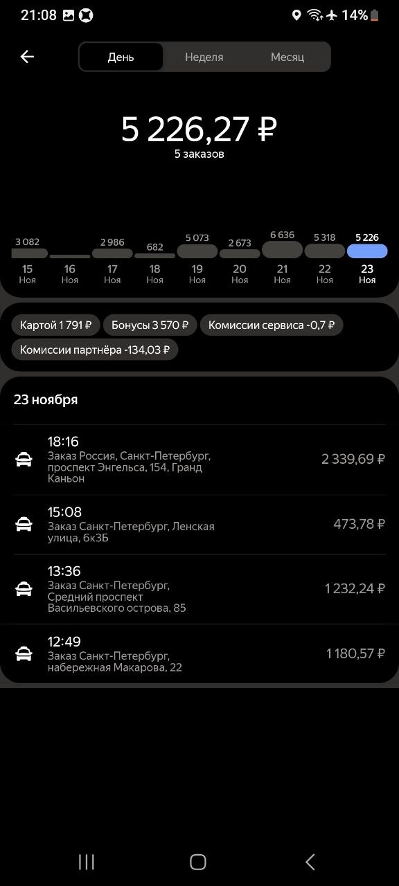 День 5 (вчера) -888 на тройку так как нужно ездить в мастерскую -800 муфты-варежки -Был заблочен поэтому работать начал с 17-00 -Проебал 963 потому что было 2 заказа и один я нечаянно подтвердил -1208 за 5 часов в мск gg 2.0 -Заказал зимние шины за 5500