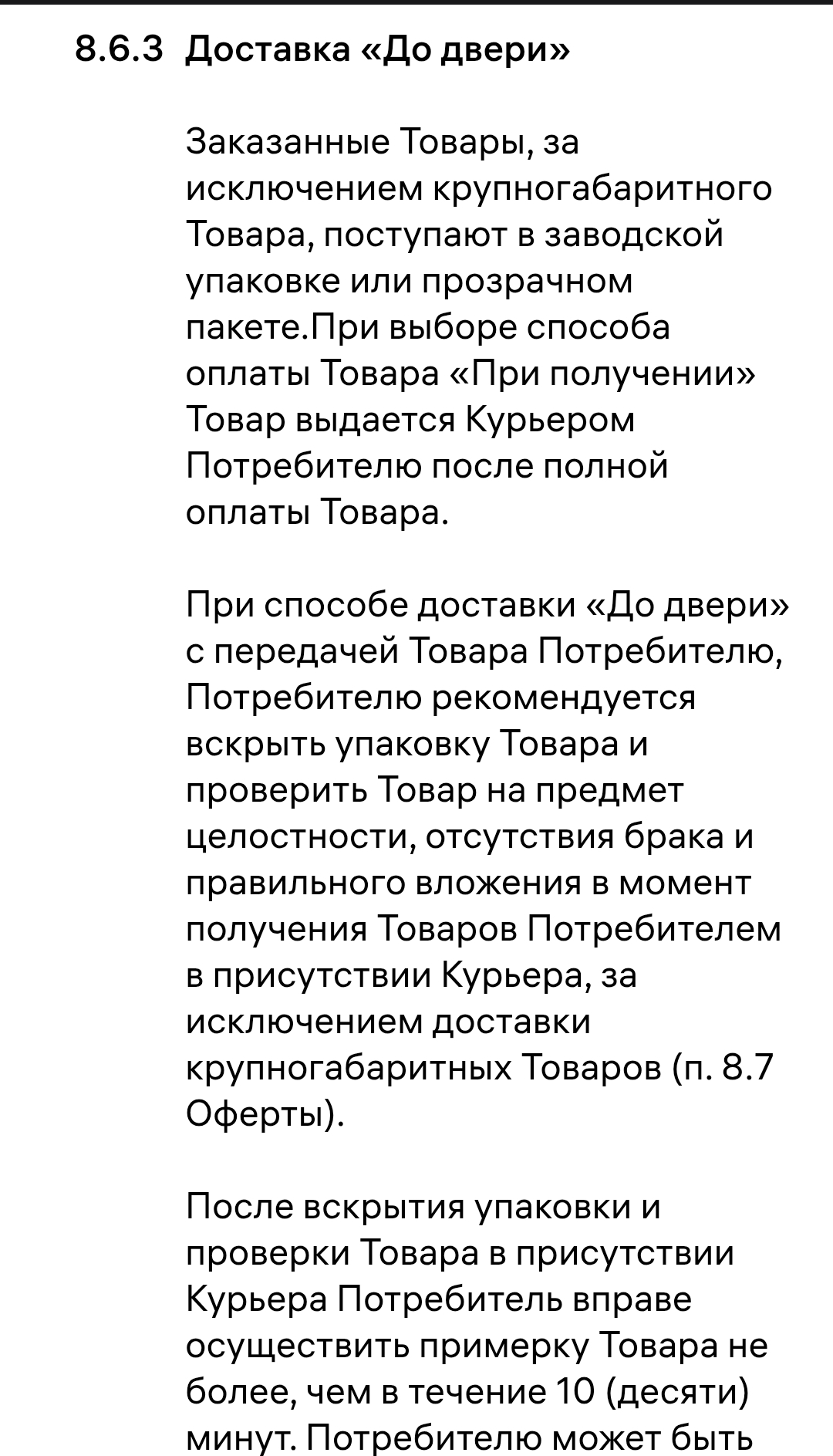 Ну бля серьезно, эта примерка ни по времени, ни по риску не окупается. В правилах и инструкциях для курьера и покупателя ничего не написано (ну в пакетных написано разве что), но даже если бы и было - нахер, страховки же нет. Какие то смски клиентам, косвенные упоминания при оформлении заказа на сайте или фраза "если клиент захотел померить" в единственном ТГ посте - это чушь. В лучшем случае проебешь бонус или другой заказ, в худшем - будешь ебаться с неустойкой. Ладно там в мухосранях может других заказов и не быть, хули поделать, вопросов нет. Но в ДСах этим точно заниматься не стоит.