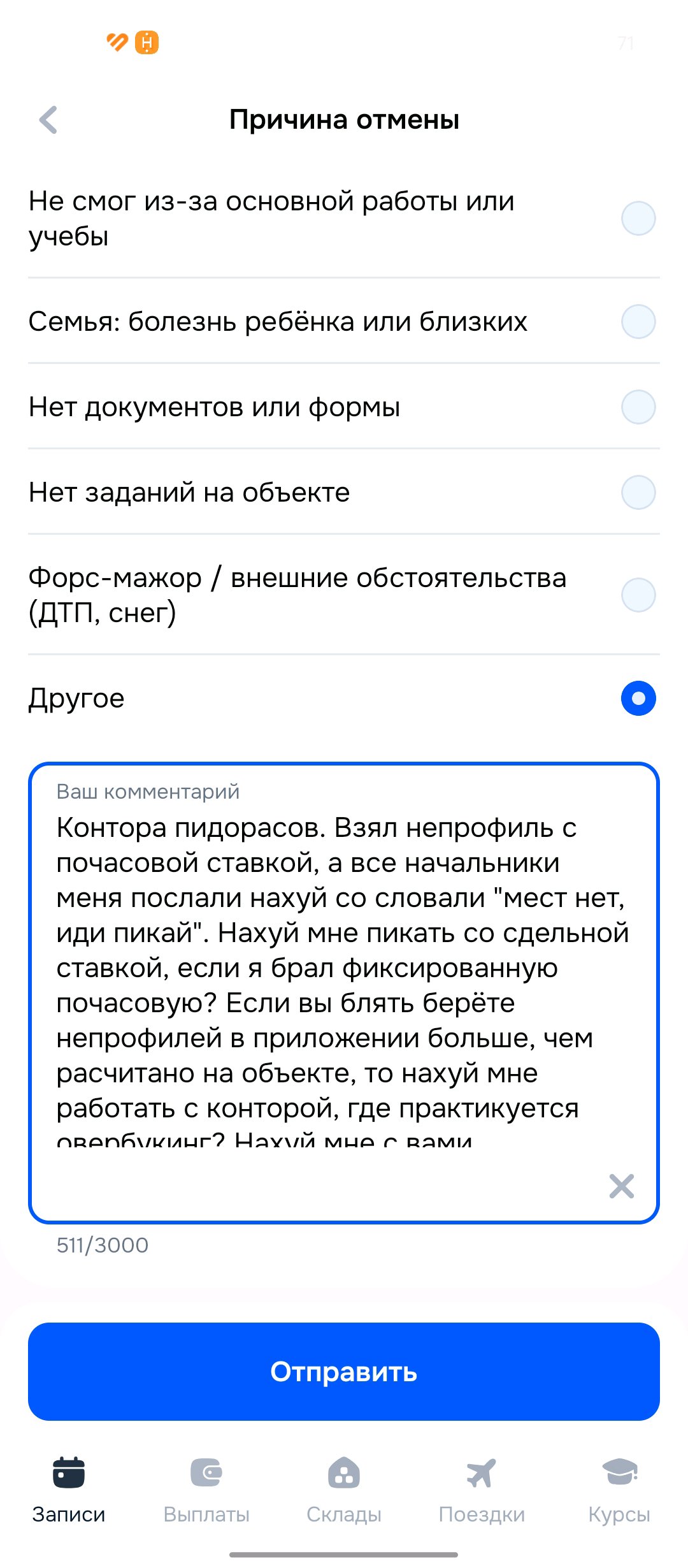 Зато на "сортировке непрофиль" с почасовой ставкой (бывшая "разгрузка/погрузка непрофиль") смены остались для записи на год вперёд, но только дневные. А на "сортировке крупного товара" только ночные. Какая-то чертовщина творится, опять дебилы что-то мутят там. Пидорасы.