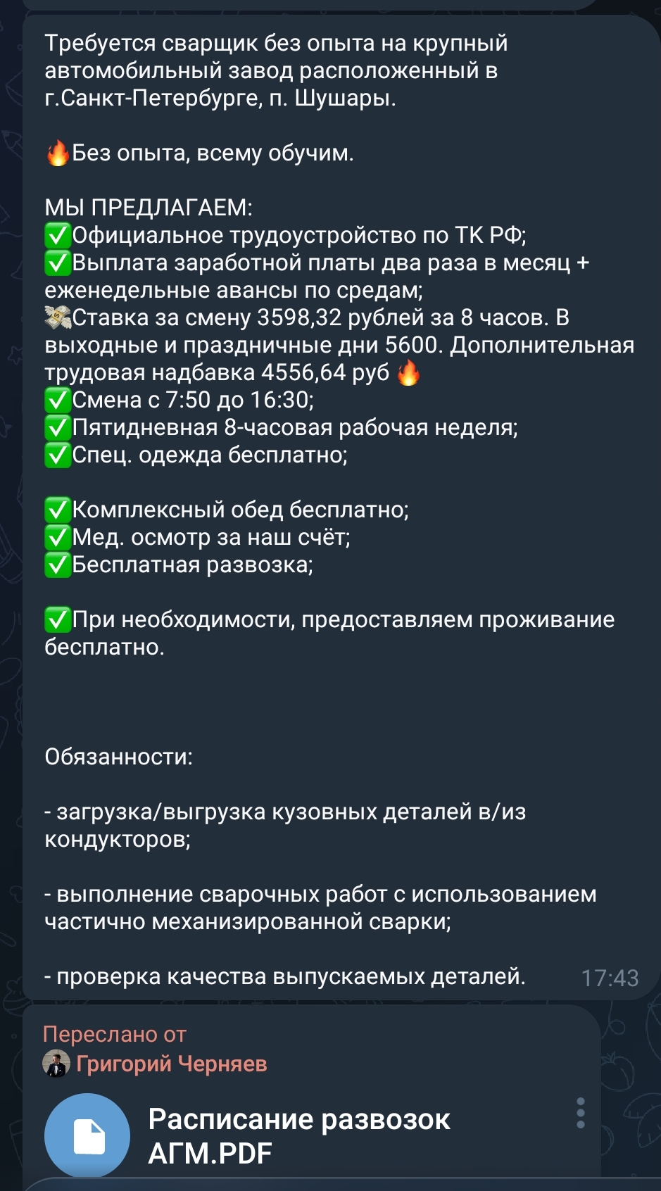 >>3254343 Ну тут госкомпания, ТК РФ, хоть какой-нибудь карьерный рост и пятидневка. А на заводах часто 2/2 с ночными сменами, на зарплату могут кинуть, карьерного роста никакого без специального образования, да ещё и какой-нибудь металлической пылью или химическими парами дышать.