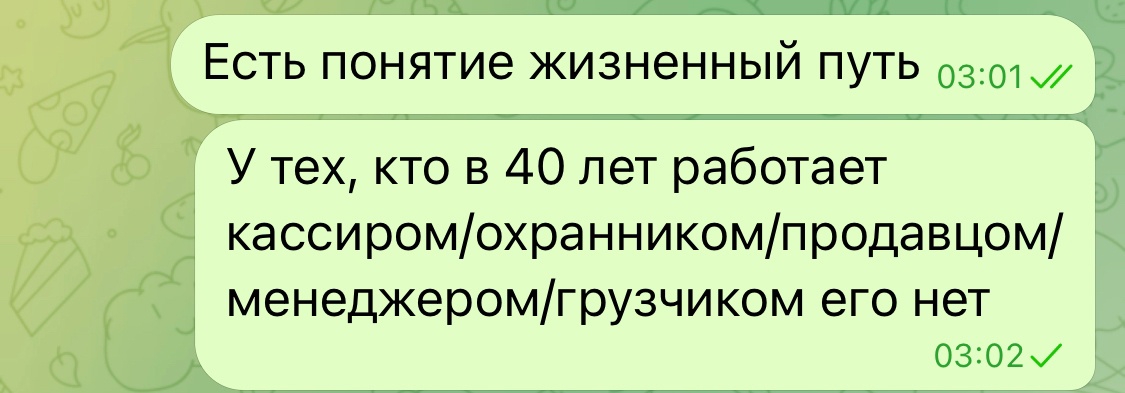 2 недели не могу найти ДНО РАБОТКУ живя в Москве) 23 лвл, пока ровесники делают семьи и уже имеют карьеру, я в такие вот года получаю отказы на донных работках типа менеджера по продажам, кол центров и грузчиков