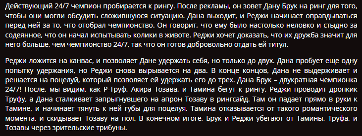 В какой же Остин прекрасной форме. Все, что мог, и что хотел, он выполнил, почти не вижу разницы с тем, что было раньше, винтажный Стив, устраивающий на ринге драку. Оуэнса похвалю, в кои-то веки, тоже, что сегмент, что его поведение в матче, мне доставили. Концовка - гениальна в своей простоте. От празднования тоже не мог оторваться. Помимо мейн-ивента смотрел только два матча, какие - говорить не буду, но, наверное, и так ясно. Так вот, все забудут уже через неделю. А мейн - это уже история. Не фанат Кевина, Остина обожаю, но далеко не так, как многих других легендарных фигур, но это эталонный мейн для такого промоушена, как WWE. Спасибо.