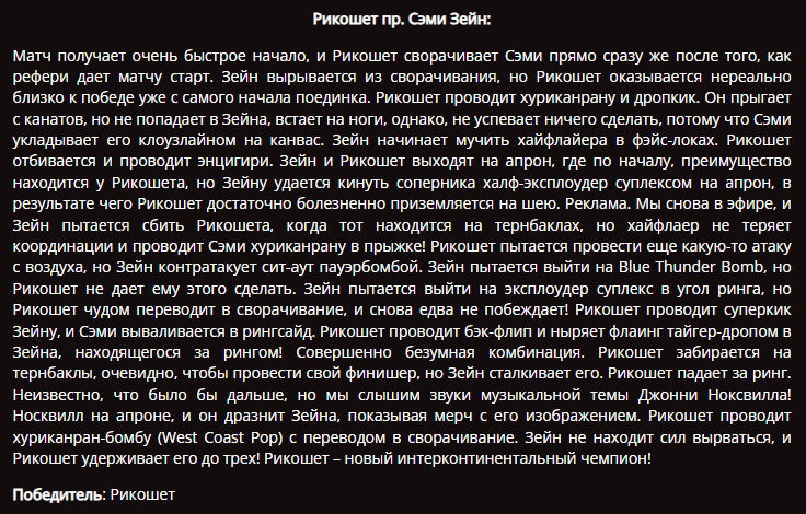 >>30081 > А в чем проблема? Дело твоё что постишь, у тебя своя аудитория, наверно им это нужно, я же перестал смотреть рестлинг из-за того что нет времени, и сейчас хочу найти ресурс где я за 5 минут раз в неделю узнаю 1) результаты матчей в ВВЕ и АУЕ, 2) новости о том кто куда ушёл/пришёл, 3) закулисные дела, 4) сливы шаболд.