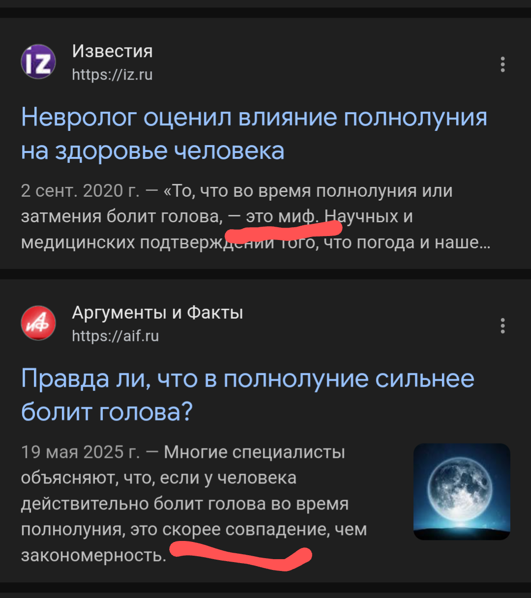 Сейчас полнолуние и у меня мигрень. И так каждый раз в полную луну. Такая же херня у многих знакомых. Внимание, вопрос - почему ученые так яро отрицают связь между состоянием людей и полнолунием? Что они скрывают?