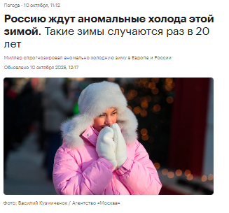 >>903415 >+11 для Ленобласти в начале августа это прям совсем не климатическая норма. Ты будешь вспоминать это время с ностальгической грустью, закладывая нагревающие пакеты в карманы под арктический пуховик этой зимой. Сказали, что за 20 лет таких морозов еще не было. Но глобальное ж потепление ж. Если морозы пойдут, крякнем все, я уже мерзну до костей, хотя еще не накрывало даже минусом. https://www.rbc.ru/life/news/68e8b8389a7947d3e946b0d0