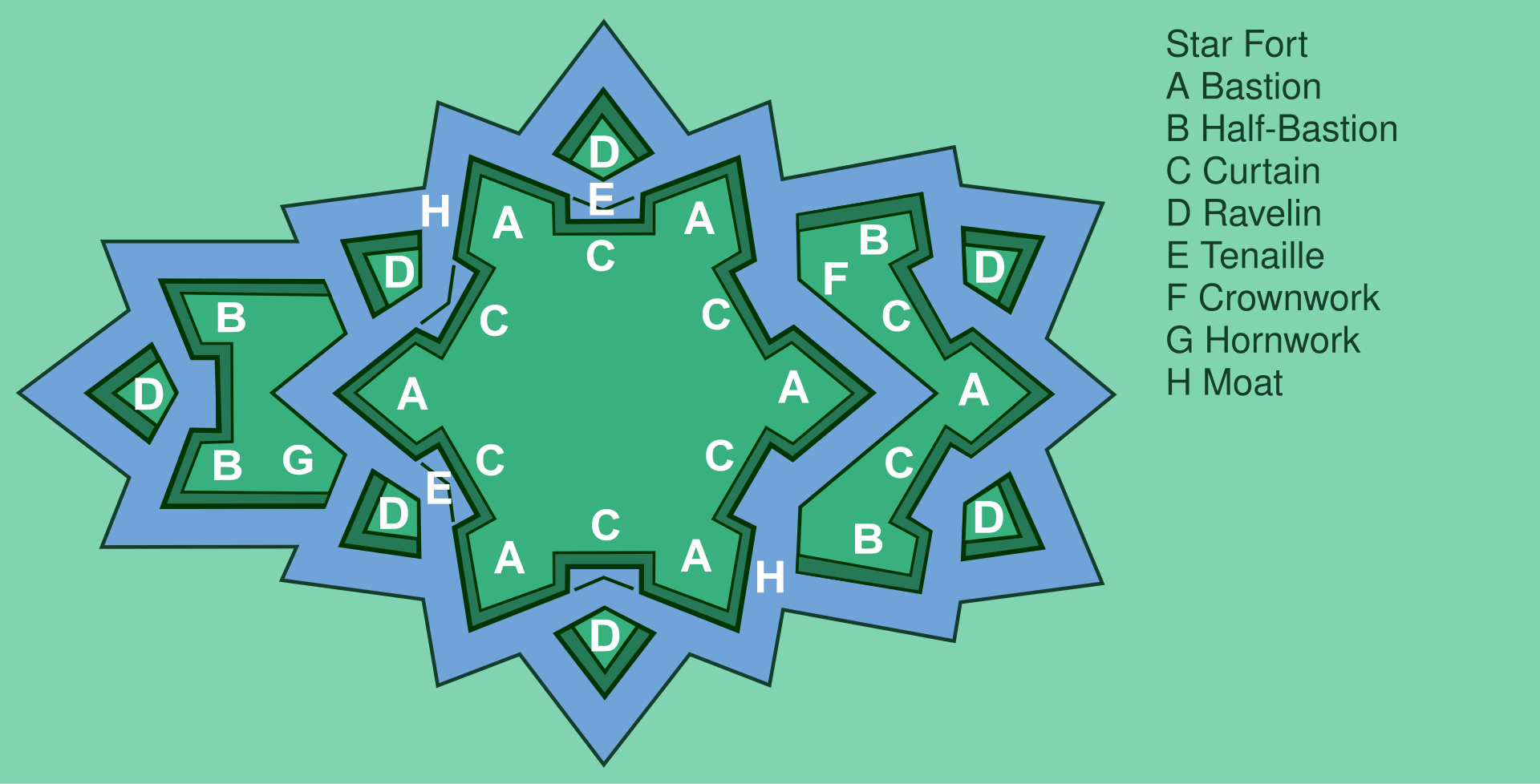 >>888371 Бастио́нная систе́ма укрепле́ний (с фр. bastion, итал. bastione, от итал. bastia — «башенное укрепление», «бастея»; также крепость-звезда или звёздная крепость от лат. Fortalitia stellaris, буквально — «звёздчатая крепость») — система фортификационных сооружений, пришедшая на смену средневековой фортификации. Бастионная система представляет собой земляной вал (куртину) с бастионами и равелинами, часто дополняющийся рвом (с водой или сухим). При взгляде сверху бастионная система имеет звездообразную форму (откуда одно из названий).